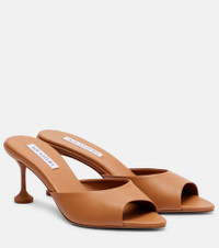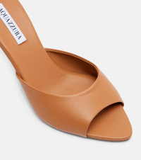 An Aquazzura shoe is a labor of love: a single pair can include over 30 components, each of which is hand-assembled by skilled artisans. The Bisous mules are expertly crafted from smooth leather and are complete with sculptural 65mm heels. Product Details - Upper: leather - Lining: leather - Sole: leather insole and sole - Toe shape: almond open toe - Made in Italy - Includes: dust bag, shoe box - Designer color name: Light Camel - Item color: brown - Item number: P01077725 Size & Fit - True to size - European sizes - 8,5cm-3.5" heel (size EU 38)