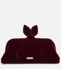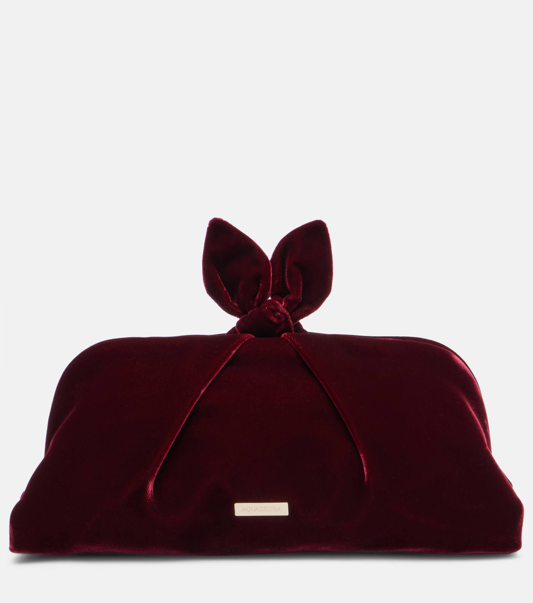 The Bow Tie Small clutch by Aquazzura is crafted from velvet and adorned with a bow motif at the top. This accessory is finished with a removable gold-toned chain strap and magnetic closure. Product Details - Material: fabric - Lining: fabric, leather - Made in Italy - Designer color name: Merlot/Light Gold - Item color: burgundy - Hardware color: gold - Internal details: single compartment - Chain shoulder strap - Color of strap: gold - Closure: magnetic fastening - Item number: P01076253 Size & Fit - Height 12cm-4.5" - Width 26cm-10" - Depth 7cm-3" - Chain length 66cm-26"
