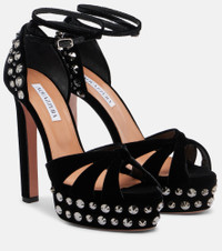 A single Aquazzura pair can include over 30 components, each of which is hand-assembled by skilled artisans. Crafted from velvet, the Cosmic Love platform sandals feature 130mm heels, ankle buckle straps, and silver-toned studs. Product Details - Upper: fabric - Lining: leather - Sole: leather insole and sole - Toe shape: almond open toe - Made in Italy - Includes: dust bag, shoe box - Designer color name: Black - Item color: black - Hardware color: silver - Closure: buckle-fastening ankle strap - Item number: P01097555 Size & Fit - True to size - European sizes - 13cm-5" heel (size EU 38) - 4cm-1.5" platform (size EU 38)