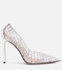 The Lumiere pumps from Aquazzura are defined by the uppers that are adorned with crystals that catch the light with every step. Made from clear PVC, they feature pointed toes and stiletto heels. Product Details - Upper: polyvinyl chloride - Lining: leather - Sole: leather insole, leather and rubber sole - Toe shape: pointed toe - Made in Italy - Includes: dust bag, shoe box - Designer color name: Silver - Item color: silver - Item number: P01077842 Size & Fit - Fits slightly large to size - we recommend trying a half size smaller - European sizes - 10,5cm-4" heel (size EU 38)