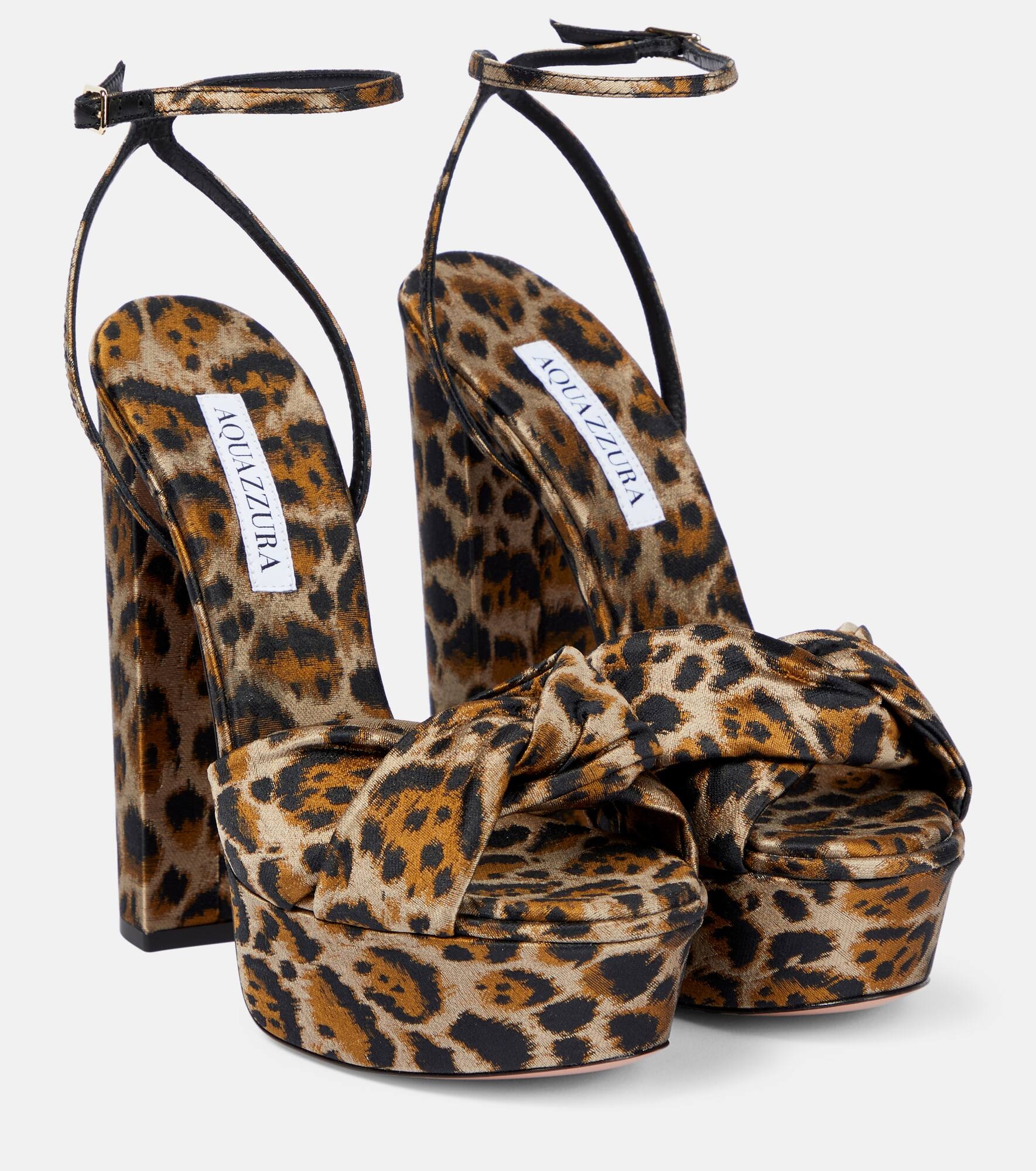 An Aquazzura shoe is a labor of love: a single pair can include over 30 components, each of which is hand-assembled by skilled artisans. This rendition of the Olie Plateau 140 sandals are a leopard-printed style. Product Details - Toe shape: round open toe - Upper: fabric - Sole: fabric insole, leather sole - Closure: buckle-fastening ankle strap - Designer color name: Caramel - Comes with a box - Made in Italy - Comes with dust bag - Item number: P00819803 Size & Fit - True to size - European sizes - 14cm-5.5" heel (size EU 38) - 4cm-1.5" platform (size EU 38)