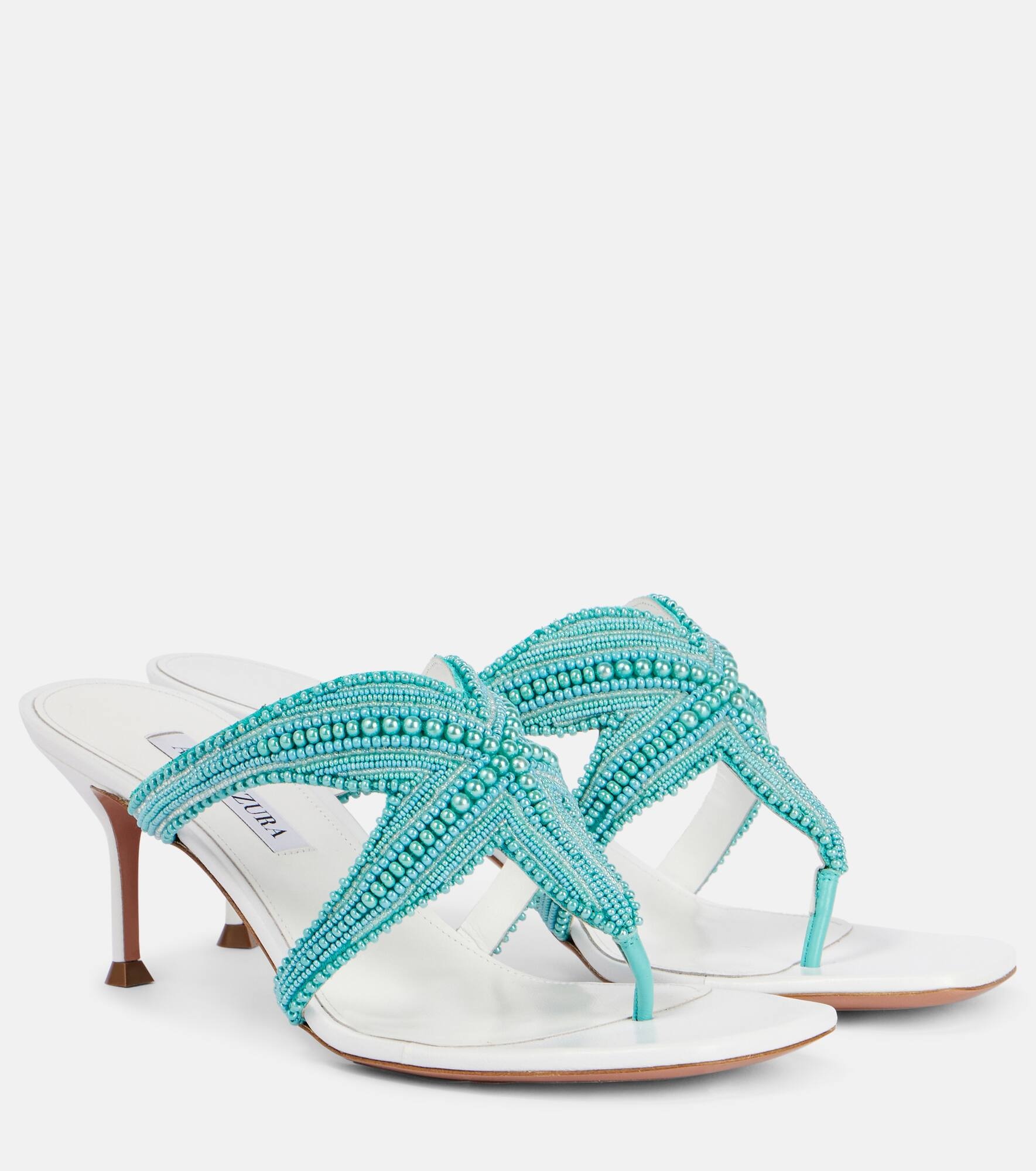 The Reef Star sandals from Aquazzurra ooze summer playfulness. Crafted in Italy from supple leather, this style is beautifully embroidered with a starfish motif that encloses the foot. It features chic square toes, T-bar straps, and manageable 65mm heels. Product Details - Upper: fabric - Lining: leather - Sole: leather insole and sole - Toe shape: square open toe - Made in Italy - Includes: shoe box, dust bag - Designer color name: Light Aquamarine - Item color: blue, white - Item number: P01043232 Size & Fit - True to size - European sizes - 6,5cm-2.5" heel (size EU 38)
