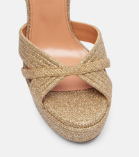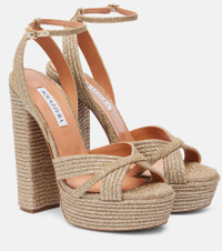 An Aquazzura shoe is a labor of love: a single pair can include over 30 components, each of which is hand-assembled by skilled artisans. The Sundance Plateau are crafted from a glittery fabric, complete with multiple band detailing, platform soles, and 140mm block heels. Product Details - Upper: fabric - Lining: leather - Sole: leather insole and sole - Toe shape: round open toe - Made in Italy - Includes: shoe box - Designer color name: Platino - Item color: silver - Contains non-textile parts of animal origin - Item number: P01077857 Size & Fit - True to size - European sizes - 14cm-5.5" heel (size EU 38) - 4,5cm-2" platform (size EU 38)