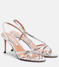 An Aquazzura shoe is a labor of love: a single pair can include over 30 components, each of which is assembled by skilled artisans. Made from silver-toned metallic leather with a snake-effect pattern, the Talk To Me sandals rest atop 75mm heels. Product Details - Upper: leather - Lining: leather - Sole: leather insole and sole - Toe shape: almond open toe - Made in Italy - Includes: shoe box, dust bag - Designer color name: Silver - Item color: silver - Slingback strap - Item number: P01138029 Size & Fit - True to size - European sizes - 7,5cm-3" heel