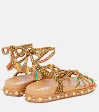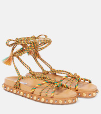 Aquazzura’s Tropical Rope sandals showcase the label’s playful side. Handwoven raffia uppers are accented with knotted rope embellishments, set on an embellished leather sole with a slight heel, balancing artisanal texture with effortless sophistication. Product Details - Upper: fabric - Lining: fabric - Sole: leather insole, rubber sole - Toe shape: round open toe - Made in Spain - Includes: shoe box, dust bag - Designer color name: Costa Tabasco - Item color: multicolor - Closure: lace-up - Hardware color: gold, silver - Item number: P01043235 Size & Fit - True to size - For narrow feet, we recommend trying a half size smaller - European sizes - 2,5cm-1" platform (size EU 38) - 3,5cm-1.5" wedge heel (size EU 38)
