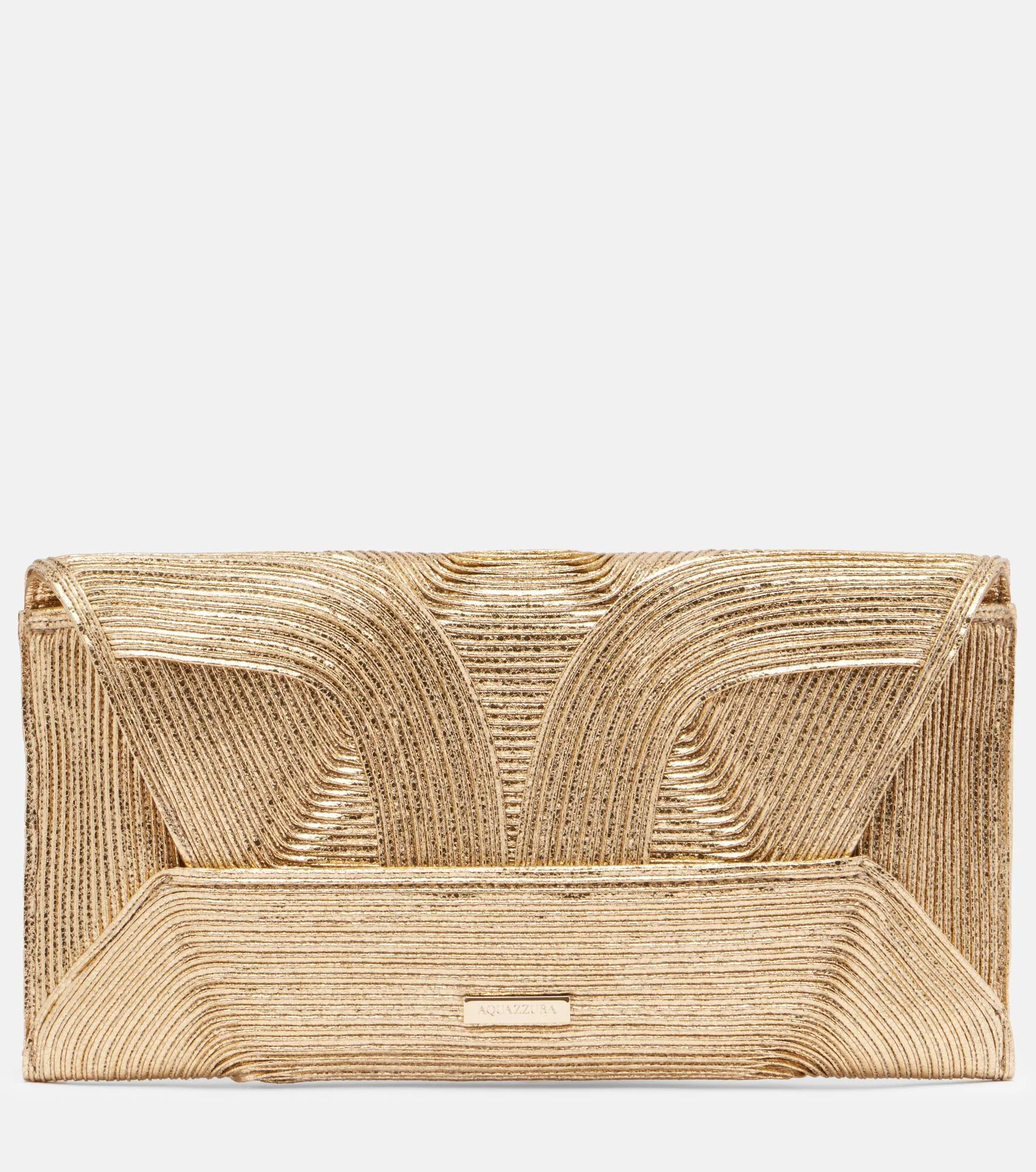 Aquazzura's Vacanza Small clutch will add a flair of elegance to your warm-weather edit. Made from woven raffia with leather trims, the design has a fold-over top revealing a signature aquamarine interior that is spacious enough for all your essentials. Product Details - Material: fabric - Lining: fabric, leather - Made in Italy - Color: gold - Designer color name: Gold/Light Gold - Item color: gold - Internal details: single compartment - Closure: slot-tab fastening - Includes: dust bag - Item number: P01123705 Size & Fit - Clutch height 13,5cm-5.5" - Clutch width 26cm-10"