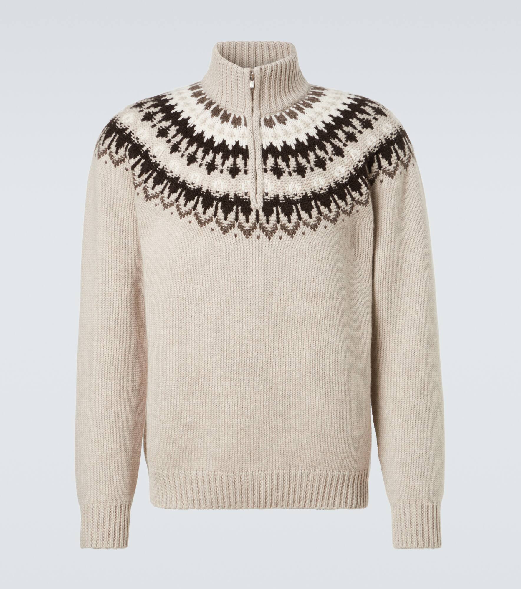Arch4 uses architecture and nature's color palette as inspiration for its exquisite cashmere designs. The Mr Saint Gervais half-zip sweater is finished with ribbed trims and Fair Isle patterning. Product Details - Material: 100% cashmere - Care instructions: dry clean - Made in China - Designer color name: Chai Fairsle - Item color: beige - Closure: partially zipped - Cuff: ribbed - Hem: ribbed - Item number: P01113185 Size & Fit - True to size - Straight fit - Slightly stretchy fabric - Falls to the hip - Height of model is 189cm-74.5" and wears a size L