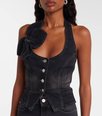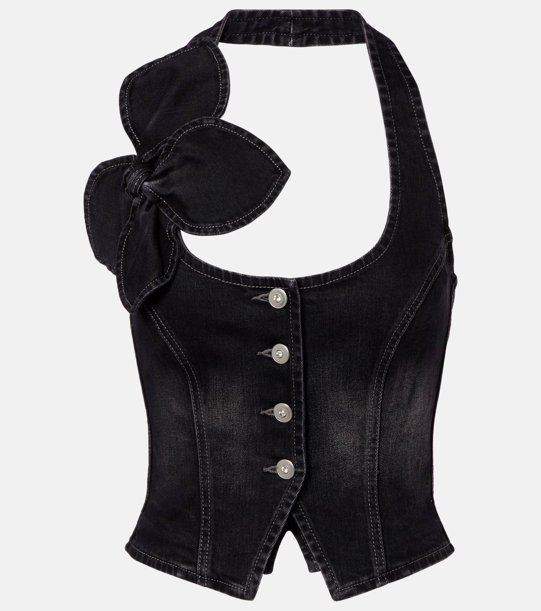 Named after the iconic New York nightclub, Area takes the glamour of party dressing in a fresh direction. This fun halterneck top is cut from sturdy cotton denim to a figure-hugging silhouette and features a voluminous bow on the strap. Product Details - Material: 100% cotton - Care instructions: machine wash at 30 degrees - Made in Italy - Designer color name: Washed Black - Item color: black - Hardware color: silver - Closure: buttoned front - Item number: P01099650 Size & Fit - True to size - Ideal fit for larger bust sizes - Low back - Cinched waist - Slightly stretchy fabric - Slightly cropped - The model seen in the picture is 178cm-5'10" and wearing a size US 4