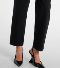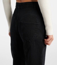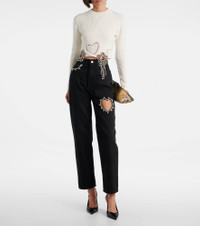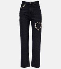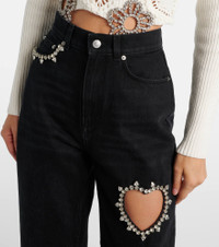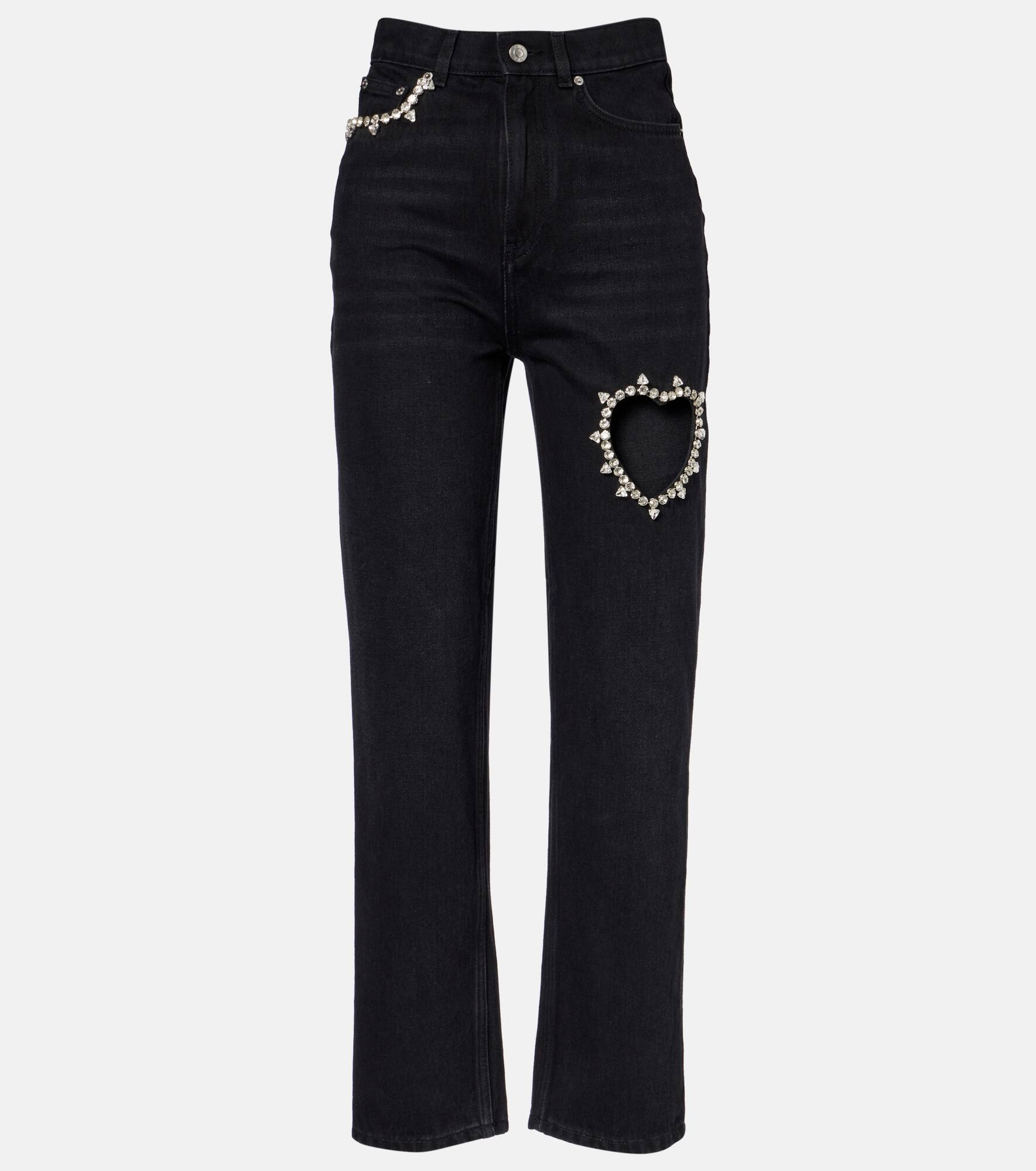 Named after the iconic New York nightclub, Area takes the glamour of party dressing in a fresh direction. These wide-leg jeans feature a high-rise silhouette with crystal embellishments outlining the pocket trim and forming a heart shape along the leg. Product Details - Material: 100% cotton - Care instructions: machine wash at 30 degrees - Made in Italy - Designer color name: Black - Item color: black, silver - Pockets: five pockets - Belt loops - Closure: zip and button fastening - Hardware color: silver - Item number: P01090542 Size & Fit - Fits small to size - we recommend trying one size larger - Non-stretchy fabric - Straight leg - High-rise - The model seen in the picture is 178cm-5'10" and wearing a size 27