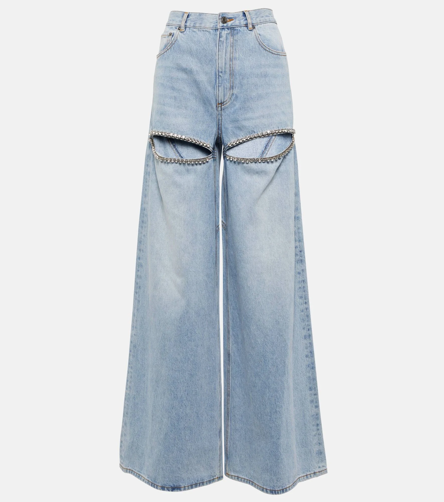 Named after the iconic New York nightclub, Area takes the glamour of party dressing in a fresh direction. These jeans have a high-rise silhouette with wide legs, and feature crystal-embellished cutouts. Product Details - Material: 100% cotton - Care instructions: machine wash at 30 degrees - Made in China - Designer color name: Light Blue - Pockets: five pockets - Closure: zipper fly, button fastening - Item number: P00844215 Size & Fit - True to size - Mid-weight material - Non-stretchy fabric - Wide-leg - High-rise - The model seen in the picture is 178cm-5'10" and wearing a size 26