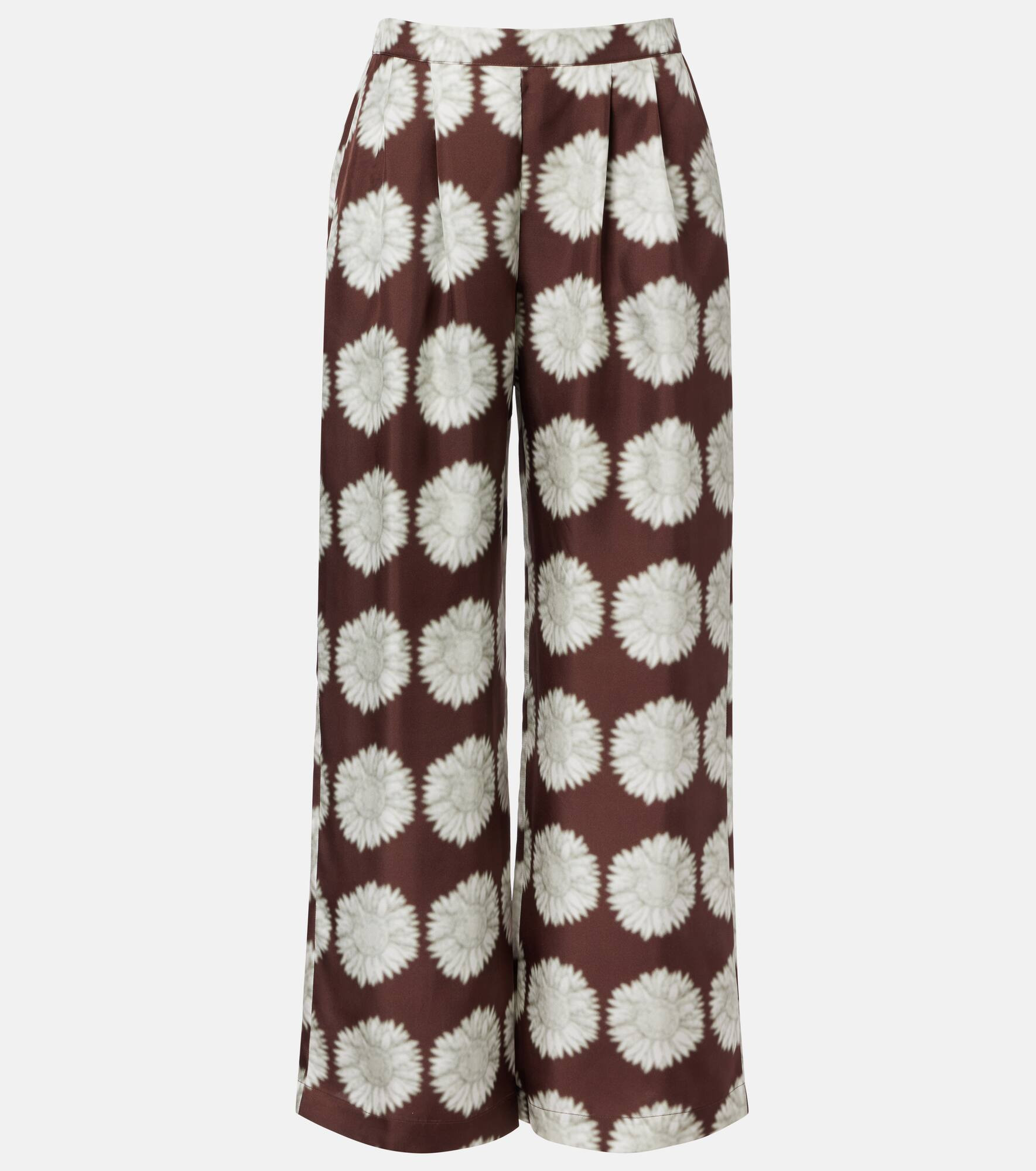 These Isola wide-leg pants by Asceno are a refined take on relaxed dressing. Crafted from pure silk twill, this piece features a lovely sunflower print, mid-rise waist, and discreet pockets. Product Details - Material: 100% silk - Care instructions: hand wash - Made in China - Designer color name: Sunflower Mahogany - Item color: brown, white - Pockets: side slit pockets - Elasticated waistband - Item number: P01073860 Size & Fit - True to size - Elasticated waist - Non-stretchy fabric - Wide-leg - The model seen in the picture is 178cm-5'10" and wearing a size XS