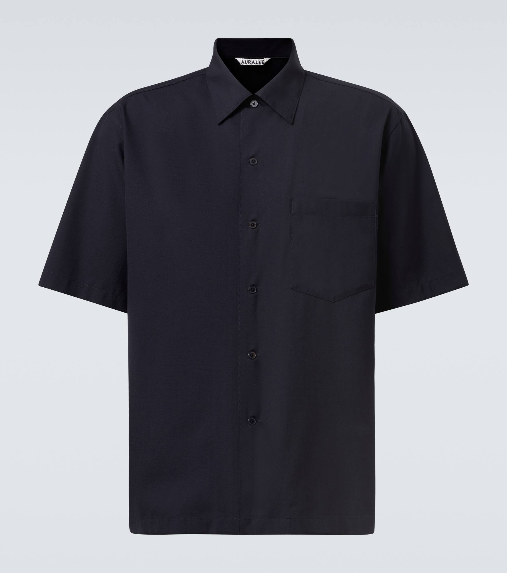 Auralee's river tailoring technique involves hand-stitching layers of fabric together to create lightweight and elegant garments. Crafted from super fine 130’s worsted wool, this short-sleeved shirt combines a crisp, cool feel with smoothness, an ideal choice for warm summer days. Product Details - Material: 100% wool - Care instructions: dry clean - Made in Japan - Designer color name: Top Dark Navy - Item color: black - Closure: buttoned front - Item number: P01029193 Size & Fit - True to size - Without pleats in the back - Classic fit - Non-stretchy fabric - Falls below the hip - The model in the picture is 185cm-6'1" and wearing a size 4