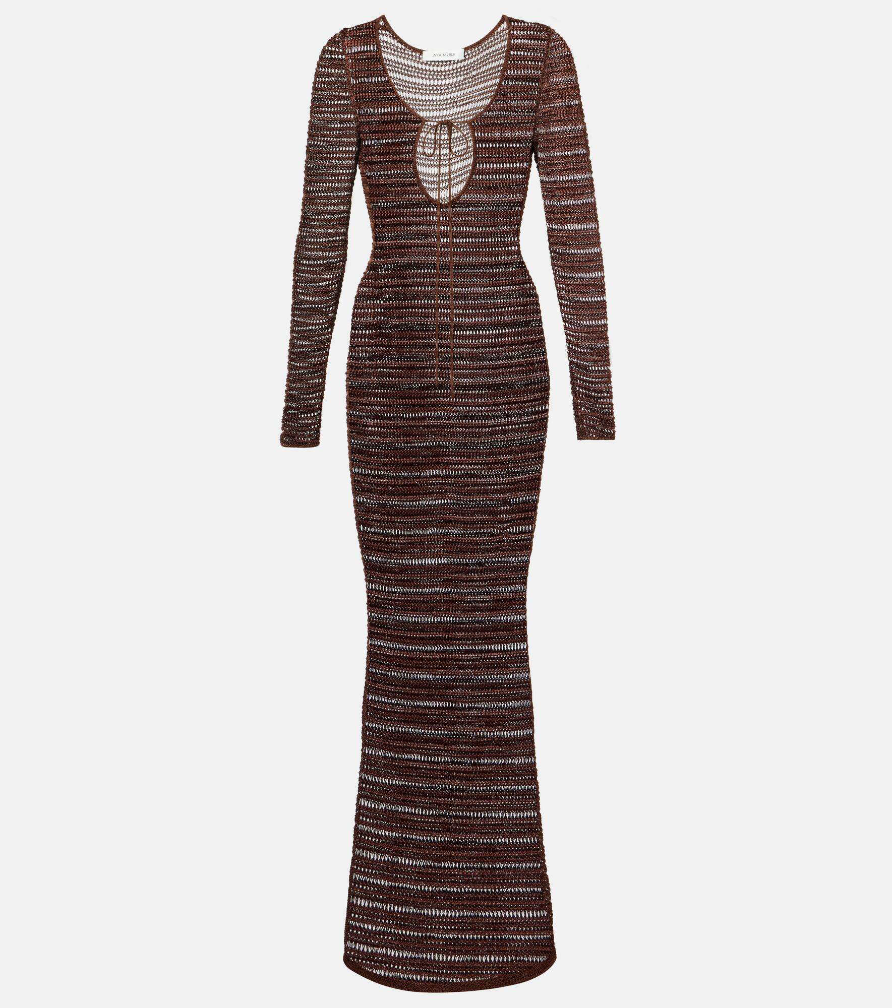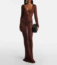 Designed in Los Angeles, Aya Muse has established itself as a go-to destination for standout essentials and empowering eveningwear. This maxi dress features an open-knit design, with a plunging neckline and tie-detail at the front. Product Details - Material: 100% viscose - Care instructions: dry clean - Made in China - Designer color name: Dark Brown - Item color: brown - Closure: self-ties - Item number: P01041695 Size & Fit - True to size - Sheer - Fitted - Stretchy fabric - The model seen in the picture is 178cm-5'10" and wearing a size XS