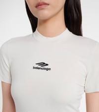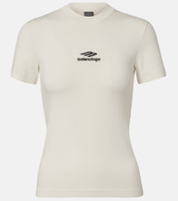 This short-sleeved top from Balenciaga is crafted in a cotton blend thermal stretch jersey and features a rounded neckline. The piece is complete with an embroidered 3B Sports Icon logo on the front. Product Details - Material: 67% cotton, 28% acrylic, 5% elastane - Care instructions: machine wash at 30 degrees - Made in Portugal - Designer color name: Chalky White/Black - Item color: white - Embroidery: 100% polyester - Collar: crewneck - Item number: P01118890 Size & Fit - True to size - Semi-sheer - Fitted - Stretchy fabric - Falls to the hip - The model seen in the picture is 178cm-5'10" and wearing a size XS