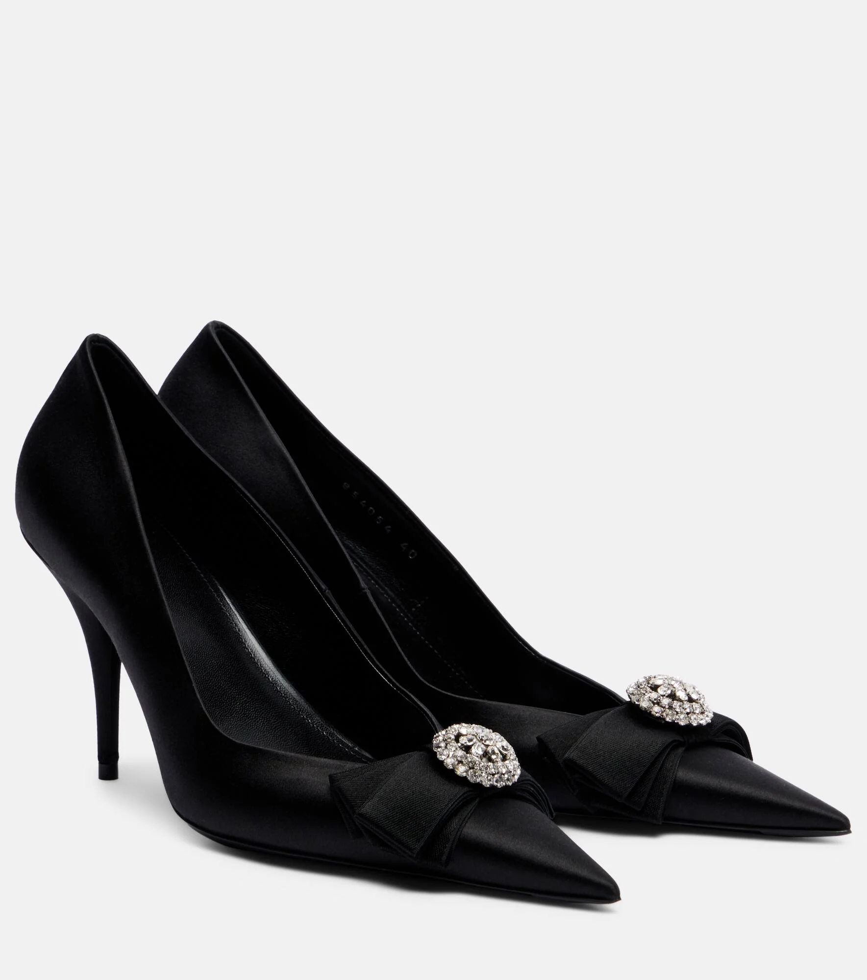 Balenciaga has evolved from the heartbeat of Paris to become one of the world’s most influential brands. Made from black satin, the Avenue Palazzo pumps feature pointed-toed silhouettes with embellished bow details and 90mm heels. Product Details - Upper: fabric - Lining: leather - Sole: leather insole and sole - Toe shape: pointed toe - Made in Italy - Includes: shoe box, dust bag - Designer color name: Black/Crystal - Item color: black - Hardware color: silver - Item number: P01126047 Size & Fit - True to size - Half sizes please take the next size down - European sizes - 9cm-3.5" heel