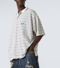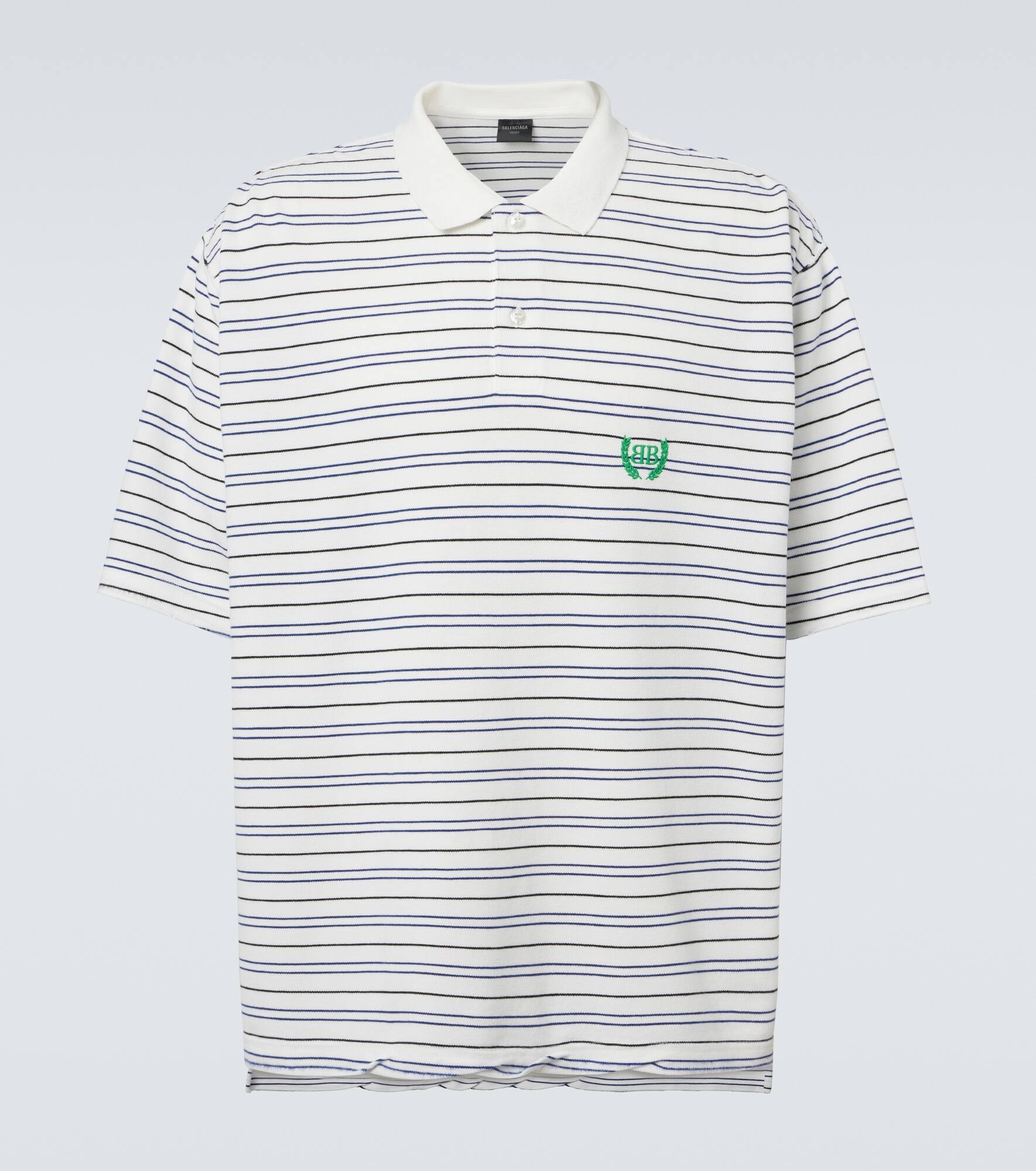 Innovation is at the heart of Balenciaga, which proudly presents its modern interpretation of fashion in every piece. Crafted from cotton pique, this polo shirt features a striped design and the BB Laurel motif embroidered at the chest. Product Details - Material: 100% cotton - Care instructions: machine wash at 30 degrees - Made in Portugal - Designer color name: White/ Blue - Item color: white, blue - Contains non-textile parts of animal origin - Closure: half-buttoned front - Item number: P01032564 Size & Fit - True to size - Unisex style - Dropped shoulders - Designed for a loose fit - Slightly stretchy fabric - Falls below the hip - Height of model is 192cm-75.5" and wears a size L