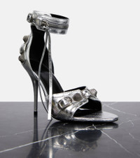 Channeling the rugged charm of the Le Cagole bag, Balenciaga's Cagole sandals feature studded leather straps and sides, and decorative buckle detailing. The ankle straps come with tasseled zip designs and are propped up on 110mm stiletto heels. Product Details - Sole: leather insole and sole - Lining: leather - Comes with dust bags - Closure: buckle-fastening ankle strap - Toe shape: round open toe - Designer color name: Silver - Made in Italy - Comes with a box - Upper: leather - Comes with extra heel tips - Item number: P00835956 Size & Fit - True to size - Slightly wide - Half sizes please take the next size down - European sizes - 11cm-4.5" heel (size EU 38)