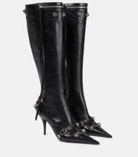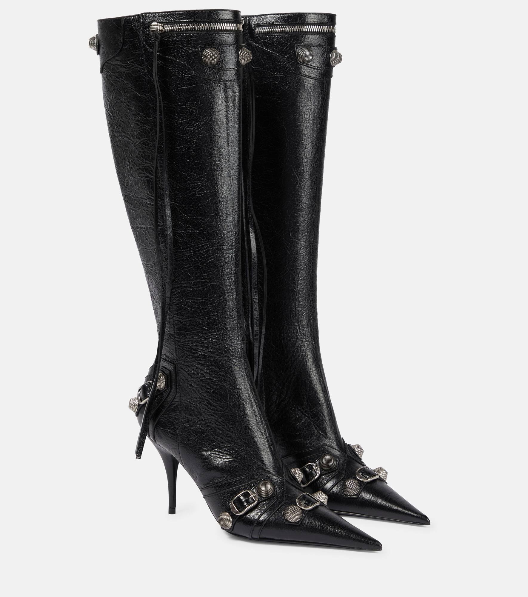 The Cagole knee-high boots feature the same grooved rivets as Balenciaga's iconic bag of the same name. They're made from grained leather and feature decorative buckles and 90mm stiletto heels. Product Details - Lining: leather - Upper: lamb leather - Sole: leather insole and sole - Comes with a box - Made in Italy - Designer color name: Black/Pallad Inv - Comes with extra heel tips - Comes with dust bag - Closure: zipped side - Toe shape: pointed toe - Item number: P00655720 Size & Fit - Fits slightly small to size - we recommend trying a half size larger - European sizes - 9cm-3.5" heel (size EU 38) - 41,5cm-16.5" shaft height (size EU 38) - 38cm-15" shaft width (size EU 38) - shaft width measured on largest part of boot