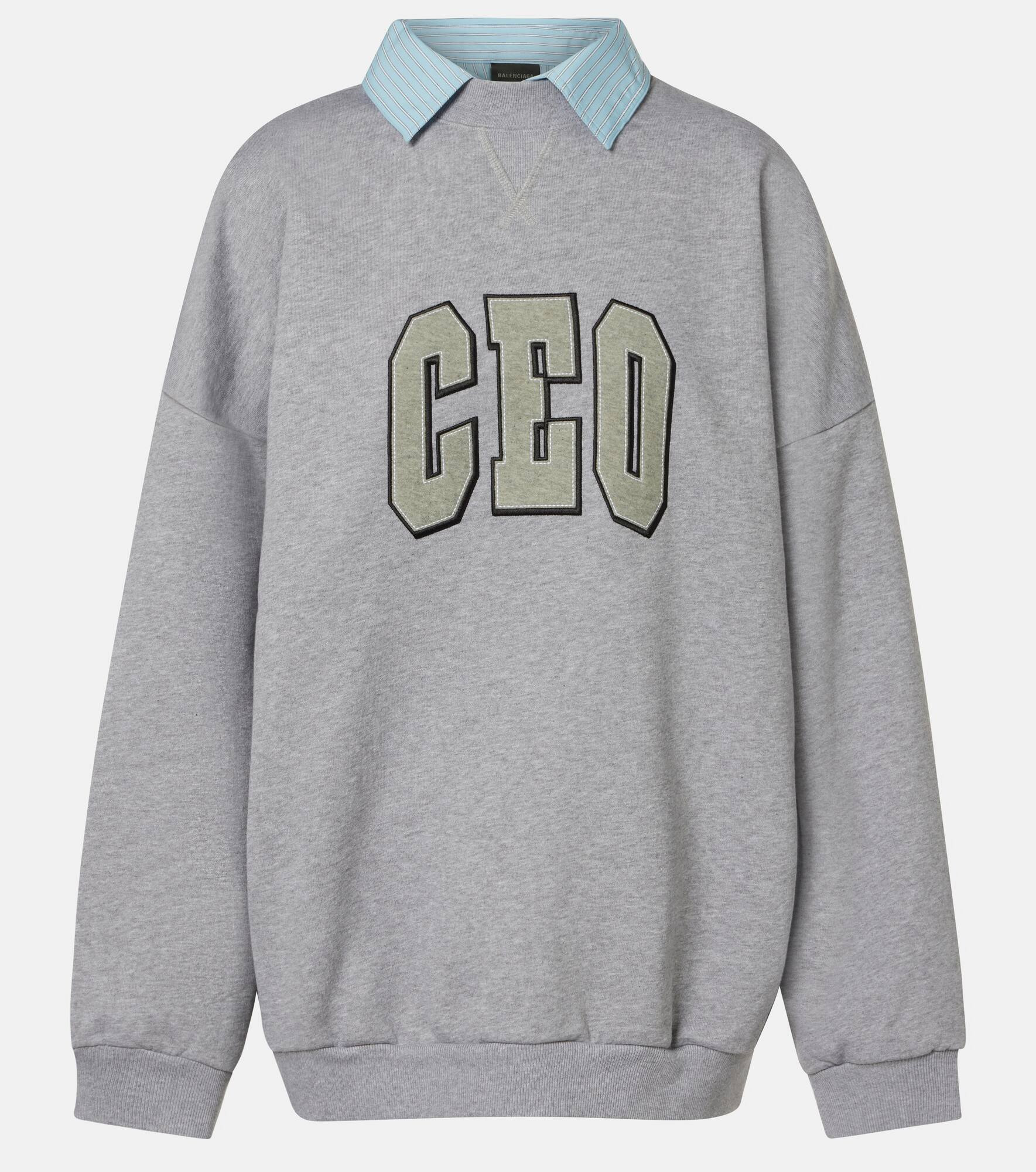 Balenciaga’s design ethos transforms a simple, casual outfit into a statement of contemporary style. Crafted from cozy cotton jersey, the CEO Team sweatshirt features a classic crewneck layered with a shirt collar, complete with a ribbed hem and cuffs. Product Details - Material: 100% cotton - Care instructions: dry clean - Made in Portugal - Designer color name: Heather Grey - Item color: gray - Material II: 83% viscose, 17% polyamide - Trim: 99% cotton, 1% elastane - Details: 100% cotton - Embroidery: 100% polyester - Contains non-textile parts of animal origin - Cuff: ribbed - Hem: ribbed - Item number: P01058283 Size & Fit - True to size - Dropped shoulders - Oversized - Non-stretchy fabric - Falls below the hip - The model seen in the picture is 178cm-5'10" and wearing a size 1