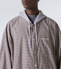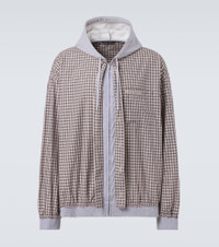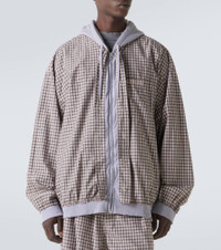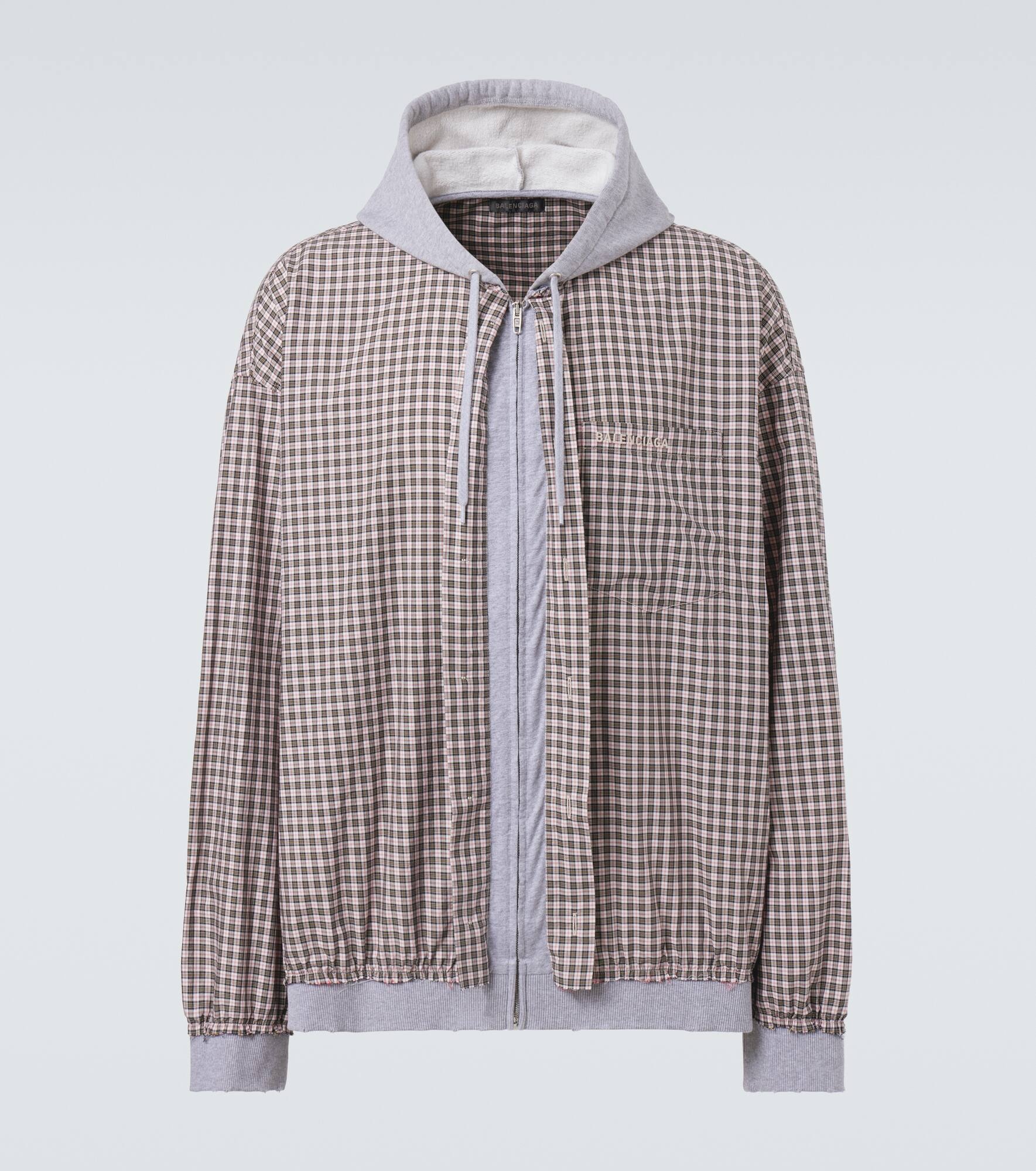 This Balenciaga jacket, crafted from cotton poplin and jersey, combines a casual checkered pattern with streetwear appeal. This piece features a zipped front closure, a drawstring hood and a chest pocket adorned with the brand's signature. Product Details - Material: 100% cotton - Care instructions: machine wash at 30 degrees - Made in Italy - Designer color name: Beige/Black - Item color: multicolor - Material II: 100% cotton - Hood: 100% cotton - Trim: 99% cotton, 1% elastane - Embroidery: 100% polyester - Contains non-textile parts of animal origin - Closure: zipped front - Drawstring hood - Pockets: angled chest pocket - Item number: P01032558 Size & Fit - True to size - Dropped shoulders - Designed for a loose fit - Elasticated hem - Non-stretchy fabric - Falls below the hip - Height of model is 192cm-75.5" and wears a size M