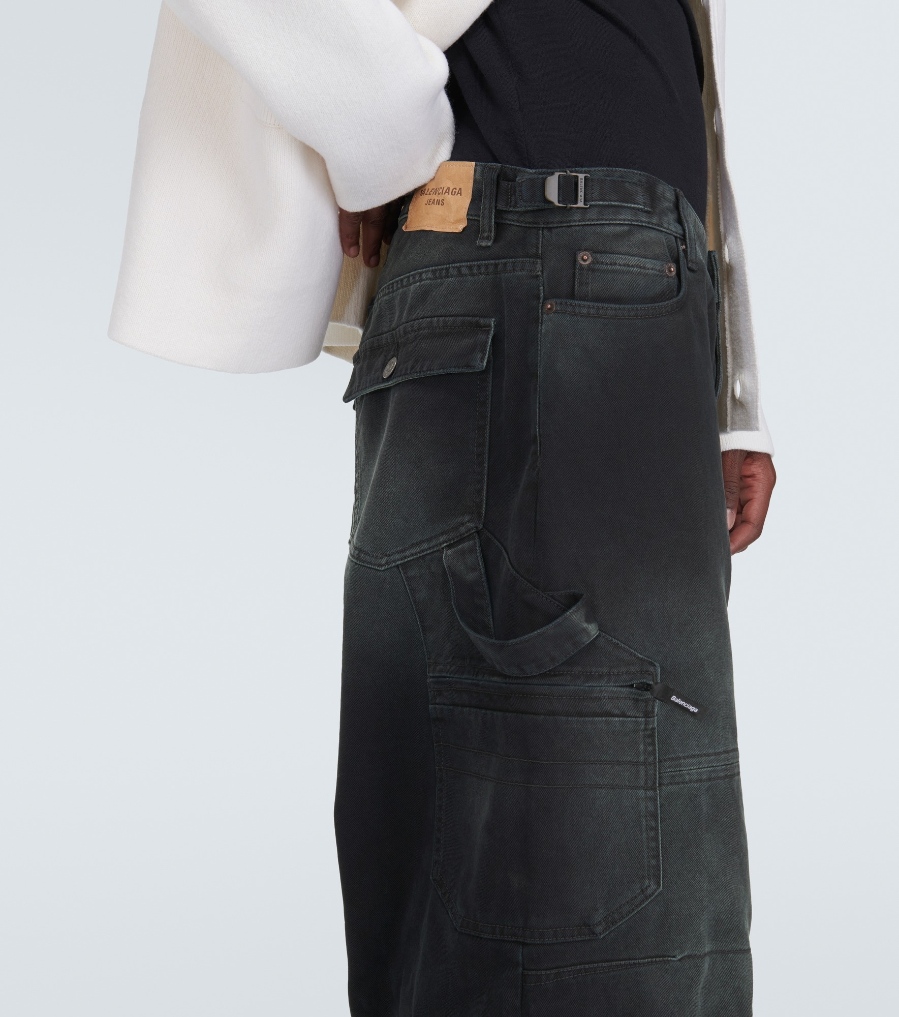 Combine comfort with style with Balenciaga. Crafted in Italy, these unisex black cargo cotton pants boast a large, mid-waisted fit with adjustable waist tabs, numerous pockets, and logo-printed zipper pull tabs. Product Details - Material: 100% cotton - Care instructions: machine wash at 30 degrees - Made in Italy - Designer color name: Sunbleached Black - Pocket lining: 65% polyester, 35% cotton - Closure: zipper fly, button fastening - Pockets: five pockets, zipped pockets - Belt loops - Item number: P00850993 Size & Fit - Fits large to size - we recommend trying one size smaller - Adjustable at the waist - Non-stretchy fabric - Wide-leg - The model in the picture is 185cm-6'1" and wearing a size S