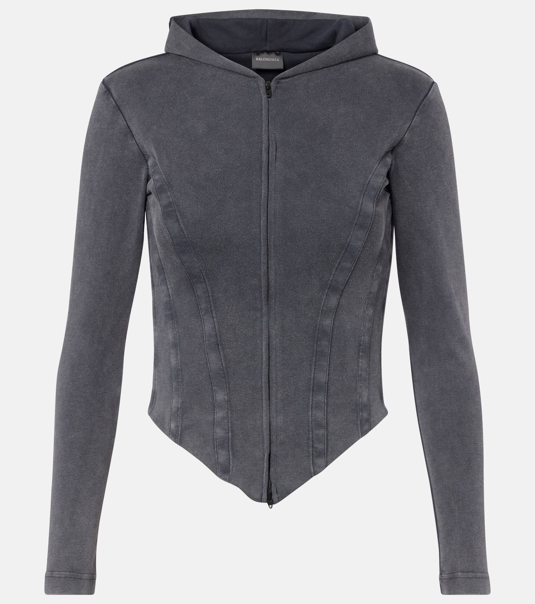This Balenciaga hoodie is shaped with a corset silhouette, blending comfort with edgy style. The garment is made from cotton jersey and showcases a paneled, structured design and a V-shaped bottom. Product Details - Material: 100% cotton - Care instructions: hand wash - Made in Portugal - Designer color name: Washed Black - Item color: black - Lining: 100% cotton - Hood - Cuff: ribbed - Closure: zipped front - Boning - Item number: P01092741 Size & Fit - True to size - Internal boned corset for support - Fitted - Non-stretchy fabric - Slightly cropped - The model seen in the picture is 178cm-5'10" and wearing a size XS