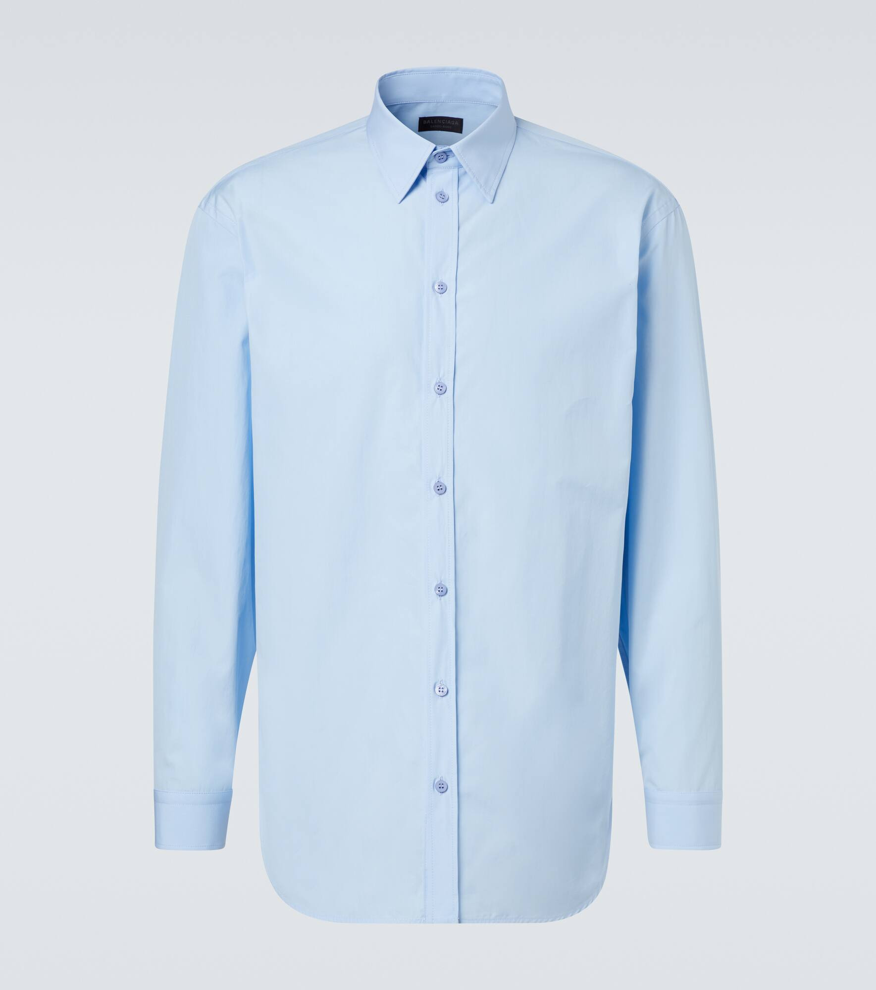 Innovation is at the heart of Balenciaga, which proudly presents its modern interpretation of fashion in every piece. This shirt is made from crisp, light blue cotton poplin in a straight silhouette. Product Details - Material: 100% cotton - Care instructions: dry clean - Made in Italy - Designer color name: Baby Blue - Item color: blue - Embroidery: 100% polyester - Contains non-textile parts of animal origin - Collar: classic (Straight point) - Cuff: buttoned - Closure: buttoned front - Item number: P01098423 Size & Fit - True to size - Without pleats in the back - Classic fit - Non-stretchy fabric - Falls below the hip - The model in the picture is 185cm-6'1" and wearing a size IT 50