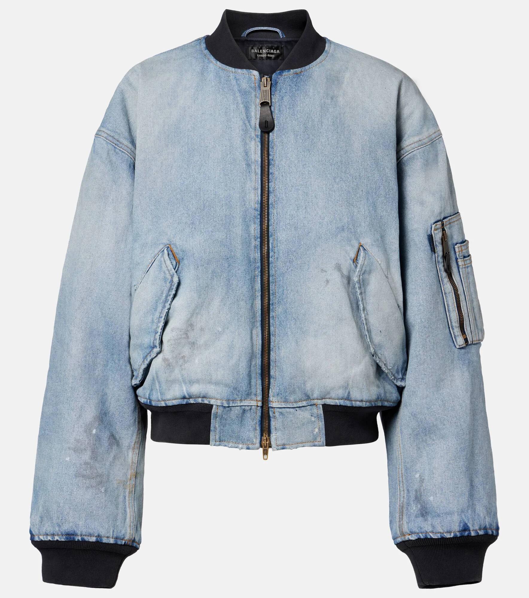 Innovation is at the heart of Balenciaga, which proudly presents its modern interpretation of fashion in every piece. This bomber jacket features a washed denim construction with a cropped, oversized silhouette. Product Details - Material: 100% cotton - Care instructions: dry clean - Made in Japan - Color: blue - Designer color name: Dirty Light Blue - Item color: blue - Trim: 100% cotton - Lining: 100% cotton - Pocket lining: 65% polyester, 35% cotton - Filling: 60% silk, 40% polylactide - Details: 100% cow leather - Contains non-textile parts of animal origin - Closure: two-way zipped front - Pockets: flap pockets, sleeve pocket - Hem: ribbed - Item number: P01118966 Size & Fit - True to size - Dropped shoulders - Elasticated hem - Oversized - Non-stretchy fabric - Falls to the hip - The model seen in the picture is 178cm-5'10" and wearing a size XS