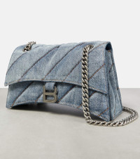 Balenciaga updates its Crush shoulder bag with this medium-sized style. In the signature curved silhouette, the blue denim design is made with a silver-toned chain strap and logo hardware. Product Details - Material: fabric - Made in Italy - Designer color name: Denim Blue - Comes with dust bag - Closure: snap-buttoned fastening - Internal details: zipped centre compartment, four internal compartments, leather lining - Chain shoulder strap - Item number: P00796494 Size & Fit - Height 15cm-6" - Max. width 25cm-10" - Max. depth 9,5cm-3.5" - Chain length 110cm-43.5"