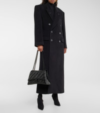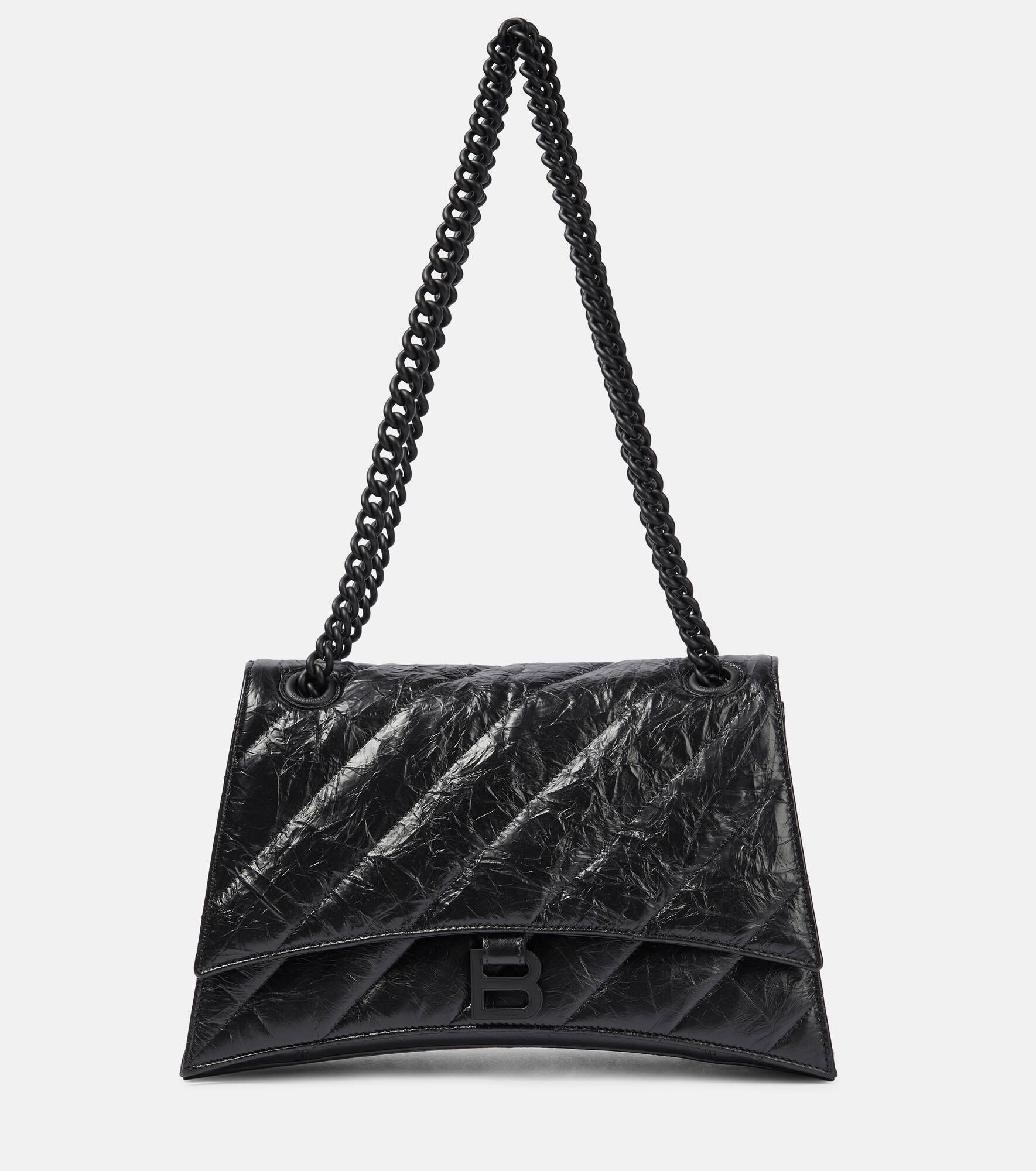 Balenciaga updates its Crush shoulder bag with an all-black design and mid-size silhouette. In the signature curved silhouette, the quilted design is made from crushed leather and has a tonal chain strap and logo hardware. Product Details - Internal details: internal zipped and slot pockets, leather lining, bill slot, Card slots - Adjustable shoulder strap - Material: calf leather - Color of chain strap: black - Designer color name: Black - Comes with dust bag, Comes with a box - Made in Italy - Closure: magnetic fastening, zipped top - Item number: P00735581 Size & Fit - Height 20cm-8" - Max. width 31cm-12" - Max. depth 12cm-4.5" - Min. chain length 67cm-26.5" - Max. chain length 115cm-45.5"