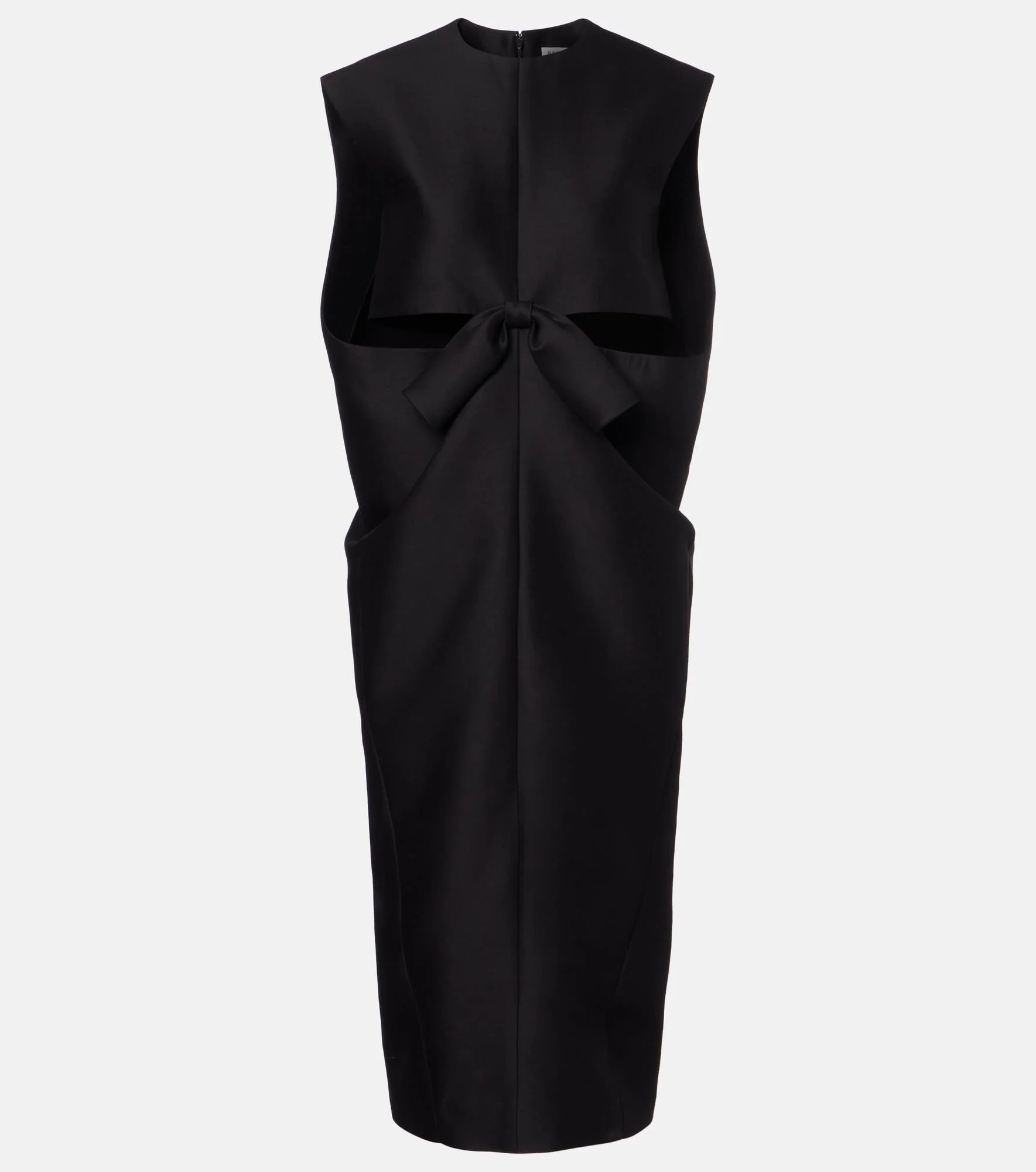Balenciaga balances bold cutouts with elegant draping in this structured midi dress. Made from crepe satin, the piece has a vent in the back and a boxy silhouette. Product Details - Material: 80% wool, 20% silk - Care instructions: dry clean - Made in Italy - Color: black - Designer color name: Black - Closure: concealed zipped back - Pockets: side slit pockets - Short vent - Item number: P01158854 Size & Fit - True to size - Close fit at the hips - Straight fit - Non-stretchy fabric - slit length 30,0cm-12" - Height of model is 180cm-71" and wears a size FR 34