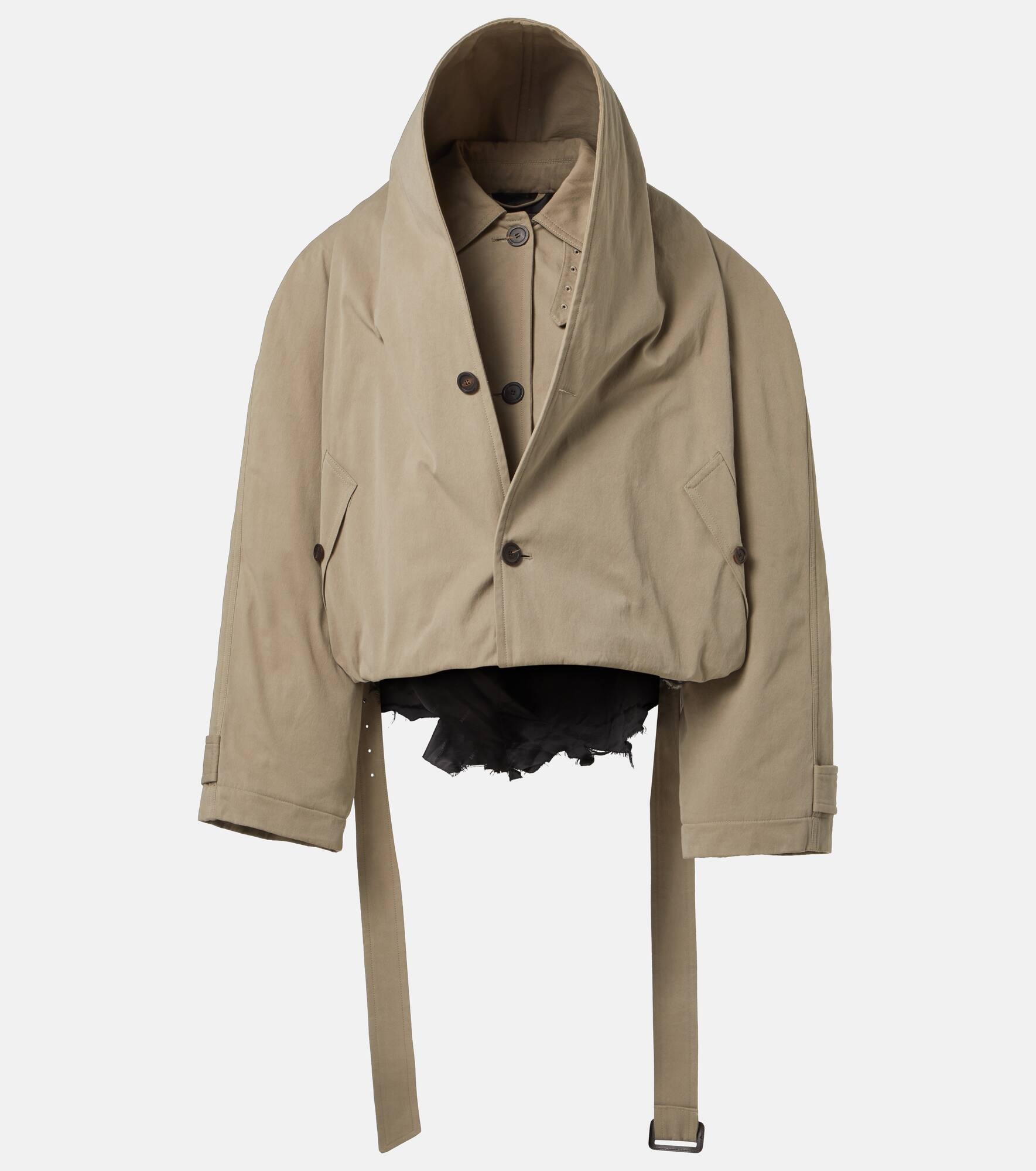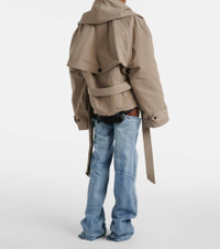 Leave it to Balenciaga to take a classic style like the trench coat and turn it upside down. Made from durable cotton, this design boasts a flipped construction that creates a voluminous, hooded silhouette with frayed detailing. Product Details - Material: 100% cotton - Care instructions: dry clean - Made in Italy - Designer color name: Dark Beige - Item color: beige - Closure: buttoned front - Hood - Pockets: buttoned pockets - Detachable belt - Lining: 73% polyester, 27% silk - Lining II: 100% cupro - Pocket lining: 100% cotton - Filling: 100% polyester - Item number: P01033728 Size & Fit - Fits large to size - we recommend trying two sizes smaller - Dropped shoulders - Adjustable at the waist - Oversized - Thick material - Non-stretchy fabric - Falls to the hip - The model seen in the picture is 178cm-5'10" and wearing a size FR 34