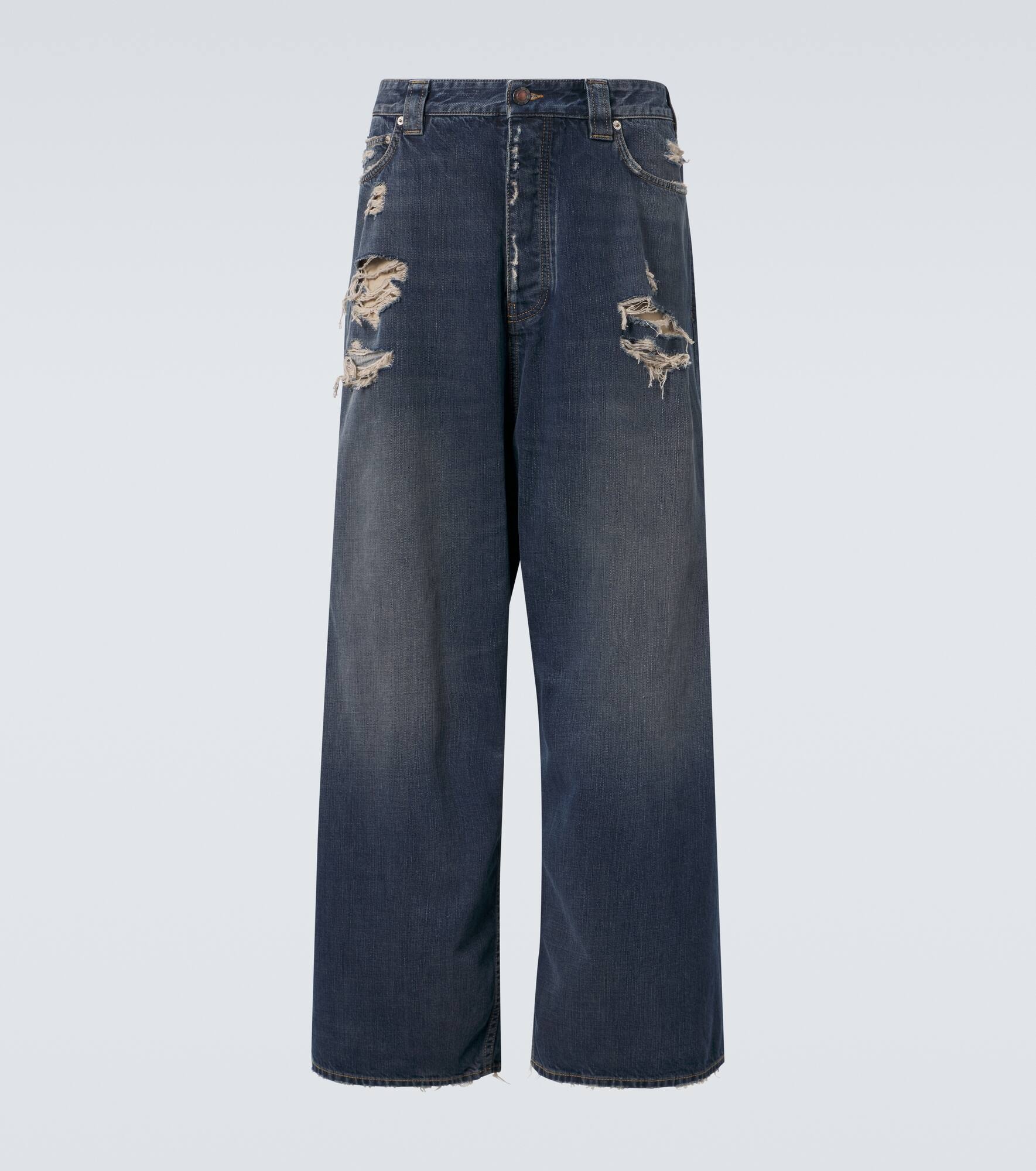 Innovation is at the heart of Balenciaga, which proudly presents its modern interpretation of fashion in every piece. These mid-rise jeans are cut to a relaxed silhouette and feature distressed details all over. Product Details - Material: 100% cotton - Care instructions: machine wash at 30 degrees - Made in Italy - Designer color name: vv - Item color: blue - Closure: concealed buttoned front - Pockets: five pockets - Item number: P01032590 Size & Fit - True to size - Unisex style - Non-stretchy fabric - Wide-leg - Mid-rise - Height of model is 187cm-73.5" and wears a size M