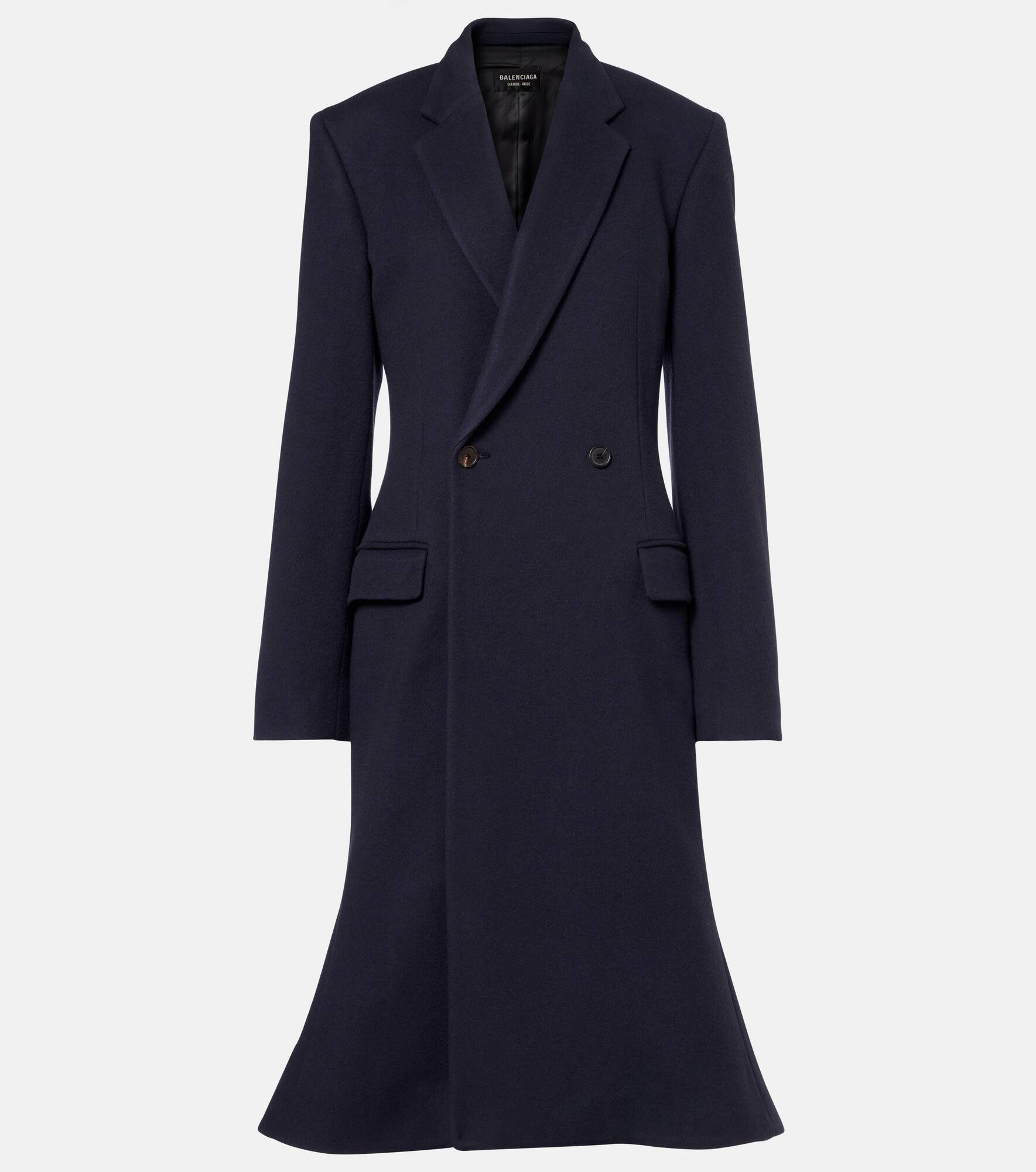 A new take on a classic silhouette, the Godet coat from Balenciaga is crafted from brushed wool to a flared, midi silhouette. The double-breasted design is finished with notched lapels and shoulder pads for a sculptural touch. Product Details - Material: 100% wool - Care instructions: dry clean - Made in Italy - Designer color name: Corporate Navy - Item color: blue - Lining: 100% cotton - Notched lapel - Pockets: flap pockets, internal pocket - Closure: double-breasted - Item number: P01092732 Size & Fit - True to size - Shoulder pad inserts - Cinched waist - Non-stretchy fabric - The model seen in the picture is 178cm-5'10" and wearing a size FR 36