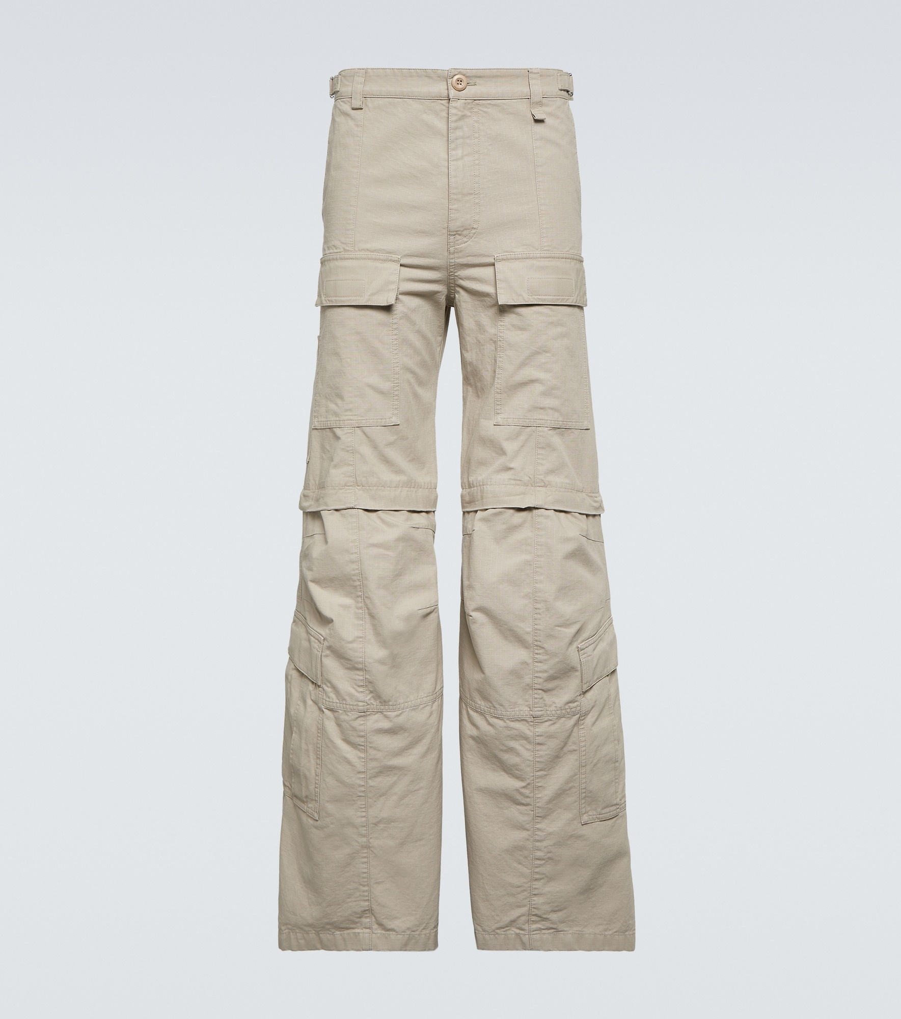 These runway-featured cargo pants from Balenciaga are a hybrid design with zips at the knees to transform the style into shorts. Expertly crafted in Italy from ripstop cotton, the style boasts a flared silhouette. Product Details - Material: 100% cotton - Care instructions: dry clean - Made in Italy - Designer color name: New Beige - Pocket lining: 100% cotton - Closure: zipper fly, button fastening - Pockets: side slit pockets, back pockets, cargo pockets - Item number: P00859199 Size & Fit - True to size - Adjustable at the waist - Non-stretchy fabric - Slim-leg with a flared hem - The model in the picture is 185cm-6'1" and wearing a size M