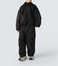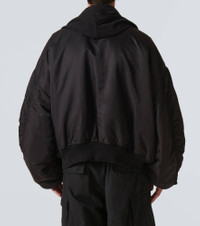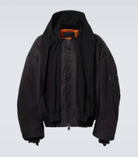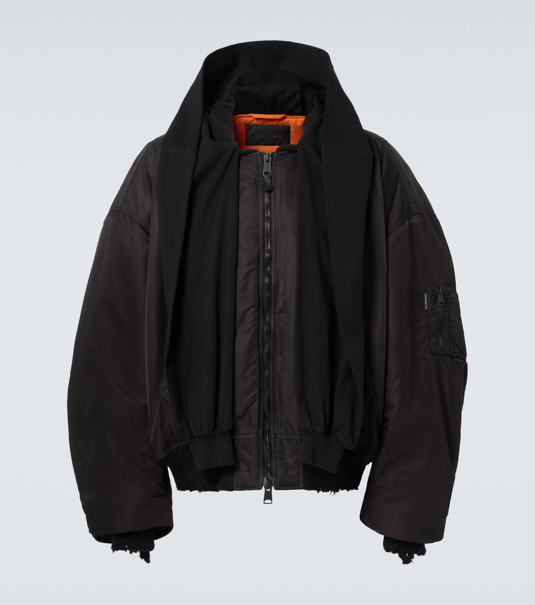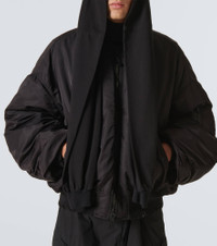 Balenciaga’s hooded bomber jacket embodies the brand's exploration of unconventional proportions. The silhouette is enlarged with padding and features dropped shoulders, a two-way zip closure, and a distressed ribbed-knit finish. Product Details - Material: 100% polyamide - Care instructions: dry clean - Made in Italy - Designer color name: Black - Material II: 100% cotton - Trim: 100% cotton - Lining: 100% polyester - Pocket lining: 100% cotton - Filling: 60% silk, 40% polylactide - Closure: two-way zipped front - Pockets: snap-buttoned pockets, zipped pockets - Distressed details - Item number: P00955182 Size & Fit - True to size - Designed for an extremely oversized fit - Dropped shoulders - Thick material - Non-stretchy fabric - Falls below the hip - The model in the picture is 185cm-6'1" and wearing a size L