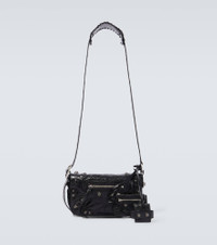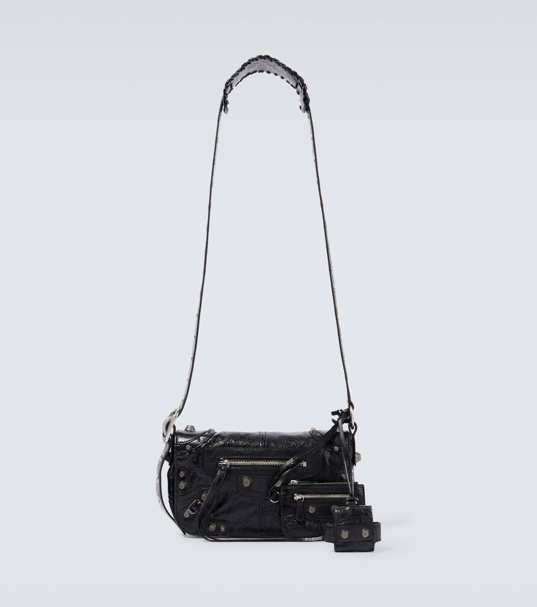 Balenciaga reinterprets its new It-family, Le Cagole, with this XS crossbody bag. Made in Italy from supple lamb leather, the compact design is punctuated with aged silver-tone hardware and comes with removable pouches. Product Details - Internal details: fabric lining, internal zipped pocket - Made in Italy - Designer color name: Black - Zipped front pocket - Closure: magnetic fastening - Material: lamb leather - Adjustable shoulder strap - Item number: P00726308 Size & Fit - Adjustable length - Height 15cm-6" - Width 24cm-9.5" - Depth 4,5cm-2" - Max. length shoulder strap 118cm-46.5" - Suitable for large smartphones (e.g. iPhone 12 Pro Max / Samsung Galaxy A72, S21 Ultra/ Huawei P40 Pro, Mate 40 pro)