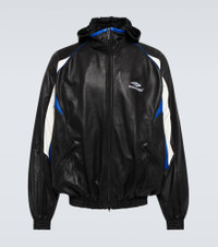 Part of Balenciaga's Winter '23 collection, this hoodie embodies effortless cool. Made from soft sheepskin, the style has an oversized fit, a kangaroo pocket, and gathered cuffs and waist. Product Details - Lining: 100% polyester, fully lined - Pocket lining: 100% cotton - Pockets: zipped pockets - Made in Italy - Hood - Designer color name: Black/Blue/White - Care instructions: specialist clean - Closure: two-way zipped front - Contains non-textile parts of animal origin - Embroidery: 100% polyester - Material: 100% lamb leather - Item number: P00765214 Size & Fit - Fits large to size - we recommend trying one size smaller - Elasticated hem - Oversized - Mid-weight material - Falls below the hip - The model in the picture is 185cm-6'1" and wearing a size 2