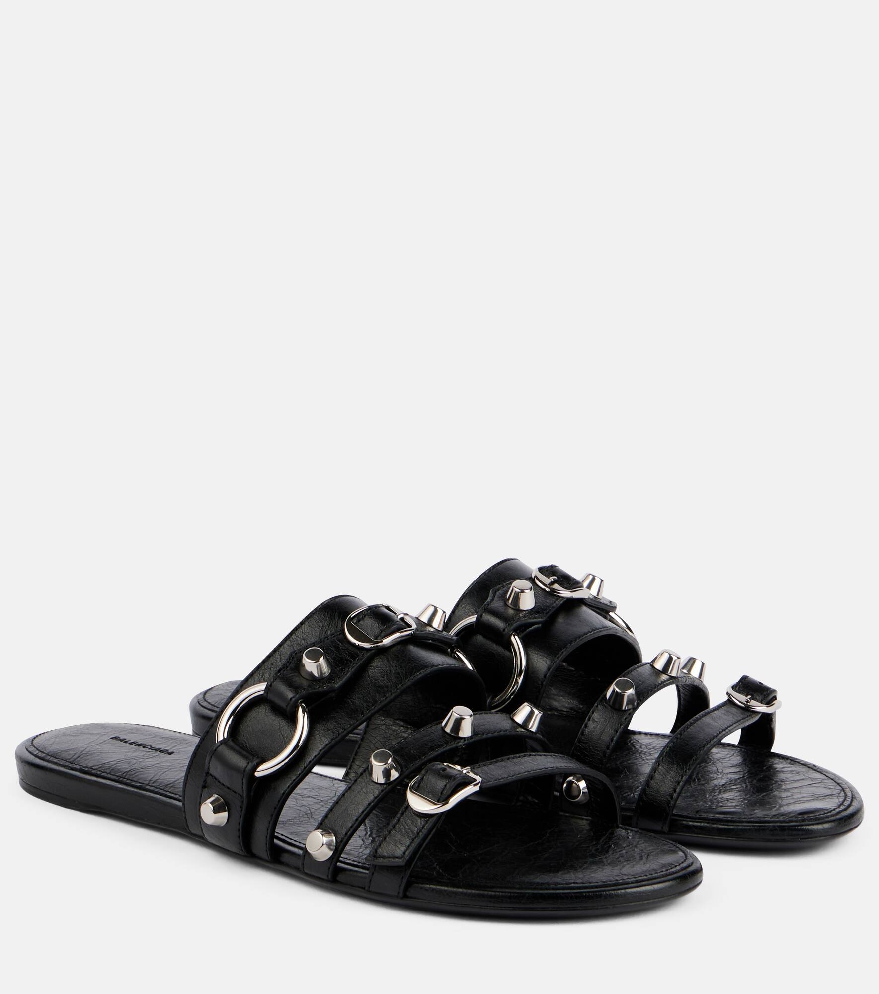 Innovation is at the heart of Balenciaga, which proudly presents its modern interpretation of fashion in every piece. These sandals are made in Italy purely from black leather. Product Details - Upper: lamb leather - Lining: lamb leather - Sole: leather insole and sole - Toe shape: round open toe - Made in Italy - Includes: shoe box, dust bags - Designer color name: Black/ Silver - Item color: black - Hardware color: silver - Item number: P01055641 Size & Fit - True to size - European sizes