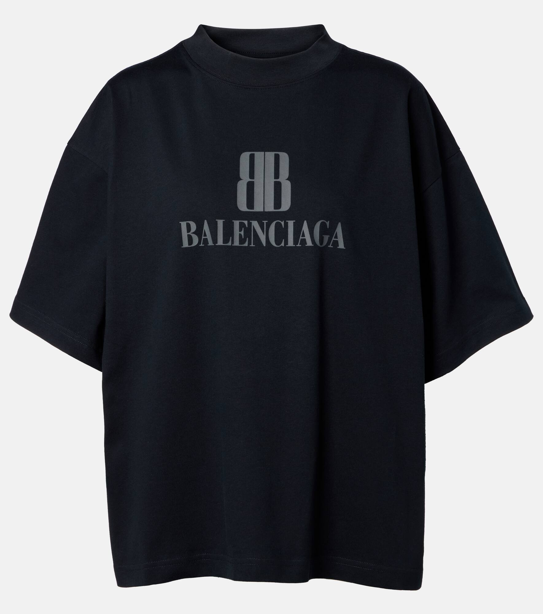 This Balenciaga T-shirt is finished with contrast logo detailing at the front and back for an instantly iconic edge. This piece is expertly crafted from pure, soft cotton jersey into a relaxed silhouette with a mockneck and dropped shoulders. Product Details - Material: 100% cotton - Care instructions: machine wash at 30 degrees - Made in Portugal - Designer color name: Faded Black - Item color: black - Trim: 97% cotton, 3% elastane - Collar: mockneck - Item number: P01058277 Size & Fit - True to size - Dropped shoulders - Oversized - Non-stretchy fabric - Falls below the hip - The model seen in the picture is 178cm-5'10" and wearing a size 1