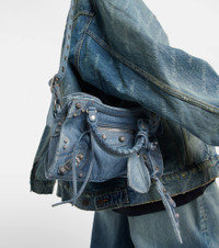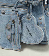 Balenciaga's Neo Cagole XS shoulder bag is rich with early '00s style elements. Made from washed and frayed denim, the trapezoidal style features crystal-embellished silver-tone hardware, an outer zip pouch, and a heart-shaped mirror charm. Product Details - Closure: zipped top - Material: fabric - Designer color name: Blue - Detachable, adjustable shoulder strap, Top handles - Internal details: fabric lining, internal zipped pocket - Made in Italy - Zipped front pocket - Item number: P00809478 Size & Fit - Height 16,5cm-6.5" - Max. width 26cm-10" - Max. depth 10,5cm-4" - Pendant length 9,5cm-3.5" - Pendant width 9cm-3.5" - Length of handles 24cm-9.5" - Min. length shoulder strap 46cm-18" - Max. length shoulder strap 106cm-41.5" - Clutch height 7,5cm-3" - Clutch width 11,5cm-4.5"