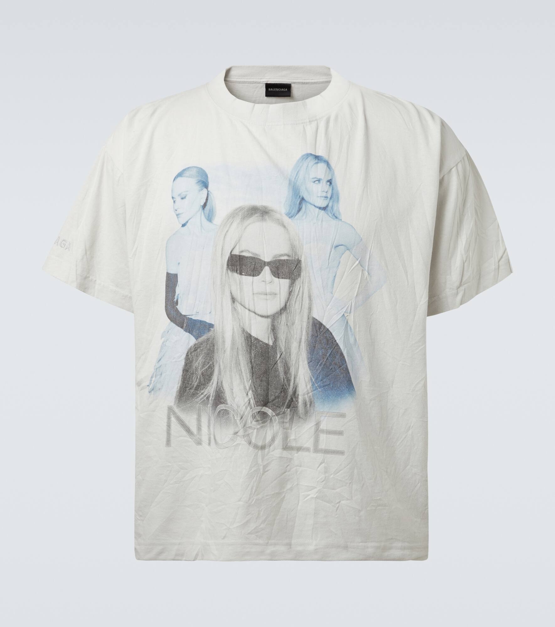This T-shirt from Balenciaga is cut from dry cotton jersey to a boxy silhouette. Presented in a crinkled finish, the design showcases a bold graphic print of Nicole Kidman on the front, and an autograph print on the back. Product Details - Material: 100% cotton - Care instructions: machine wash at 30 degrees - Made in Portugal - Designer color name: Dirty White - Item color: white - Item number: P01057359 Size & Fit - True to size - Dropped shoulders - Oversized - Slightly stretchy fabric - Falls to the hip - The model in the picture is 185cm-6'1" and wearing a size L