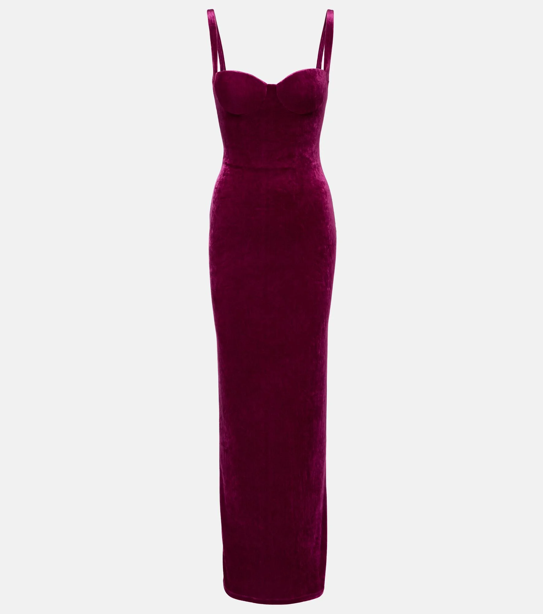 Innovation is at the heart of Balenciaga, which proudly presents its modern interpretation of fashion in every piece. Made from soft velvet into a floor-length silhouette, this gown features a bustier bodice and a revealing open back. Product Details - Material: 70% triacetate, 30% polyester - Care instructions: dry clean - Made in Italy - Designer color name: Plum - Item color: purple - Lining: 88% polyamide, 12% elastane - Lining II: 100% silk - Built-in bustier - Boning - Padded cups - Underwired cups - Closure: concealed zipped back, hook-fastening back - Long vent - Item number: P01092742 Size & Fit - True to size - Low back - Internal corset with underwire support - Fitted - Stretchy fabric - Padded, underwired top - slit length 61,0cm-24" - The model seen in the picture is 178cm-5'10" and wearing a size FR 36