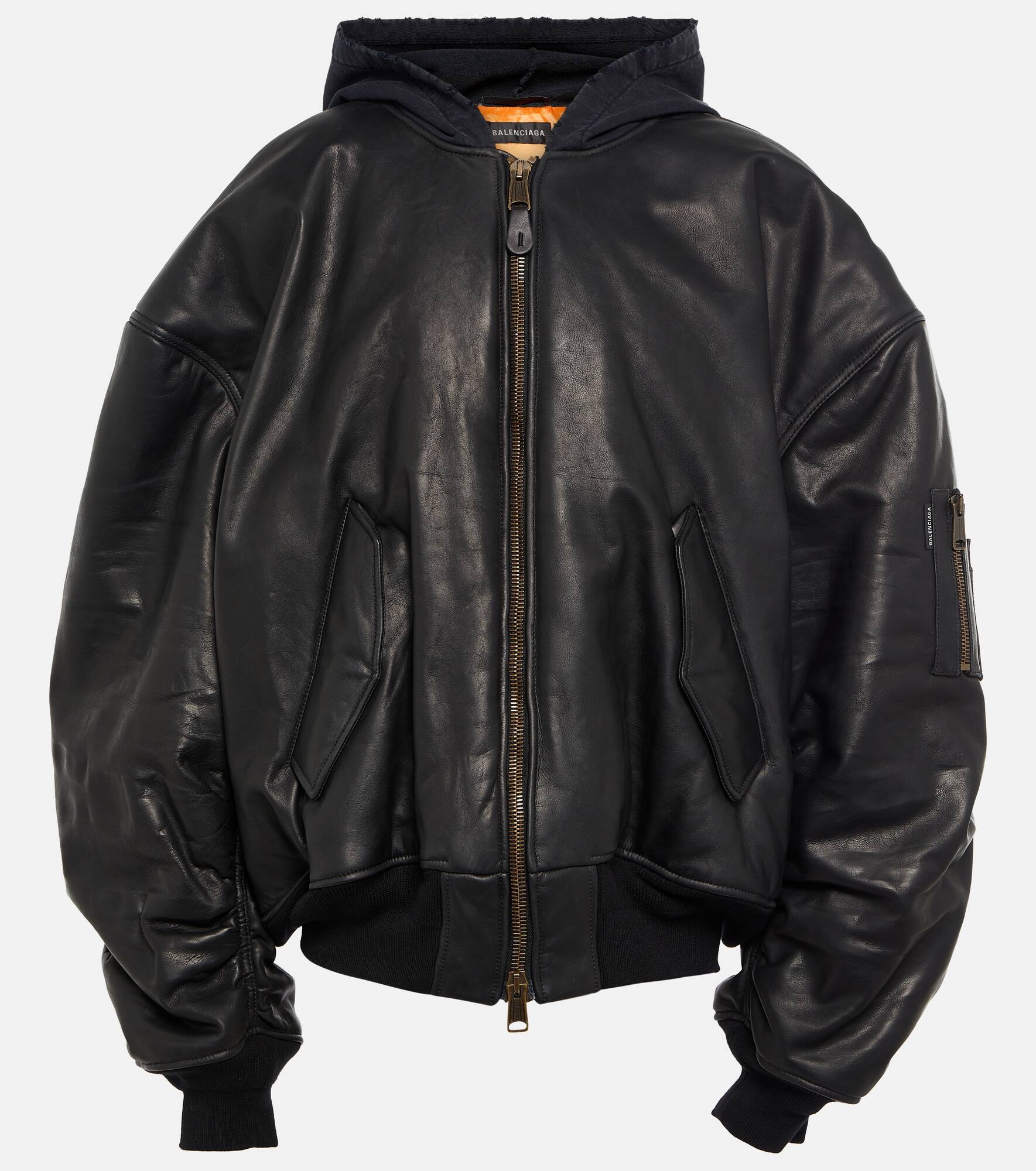 Staying 1 to the brand’s revolutionary design aesthetic, this Balenciaga bomber jacket has an oversized silhouette with exaggerated proportions. It’s made from leather with classic ribbed trims, dropped shoulders, and a zip-up front. Product Details - Made in Italy - Material: 100% leather - Closure: zipped front - Hood - Trim: 100% cotton - Pocket lining: 100% cotton - Designer color name: Black - Pockets: flap pockets, snap-buttoned pockets - Care instructions: specialist clean - Lining: fully lined, 100% cupro - Contains non-textile parts of animal origin - Item number: P00833875 Size & Fit - Fits large to size - we recommend trying one size smaller - Designed for an extremely oversized fit - Dropped shoulders - Heavy material - Thick material - Falls to the hip - The model seen in the picture is 178cm-5'10" and wearing a size XS