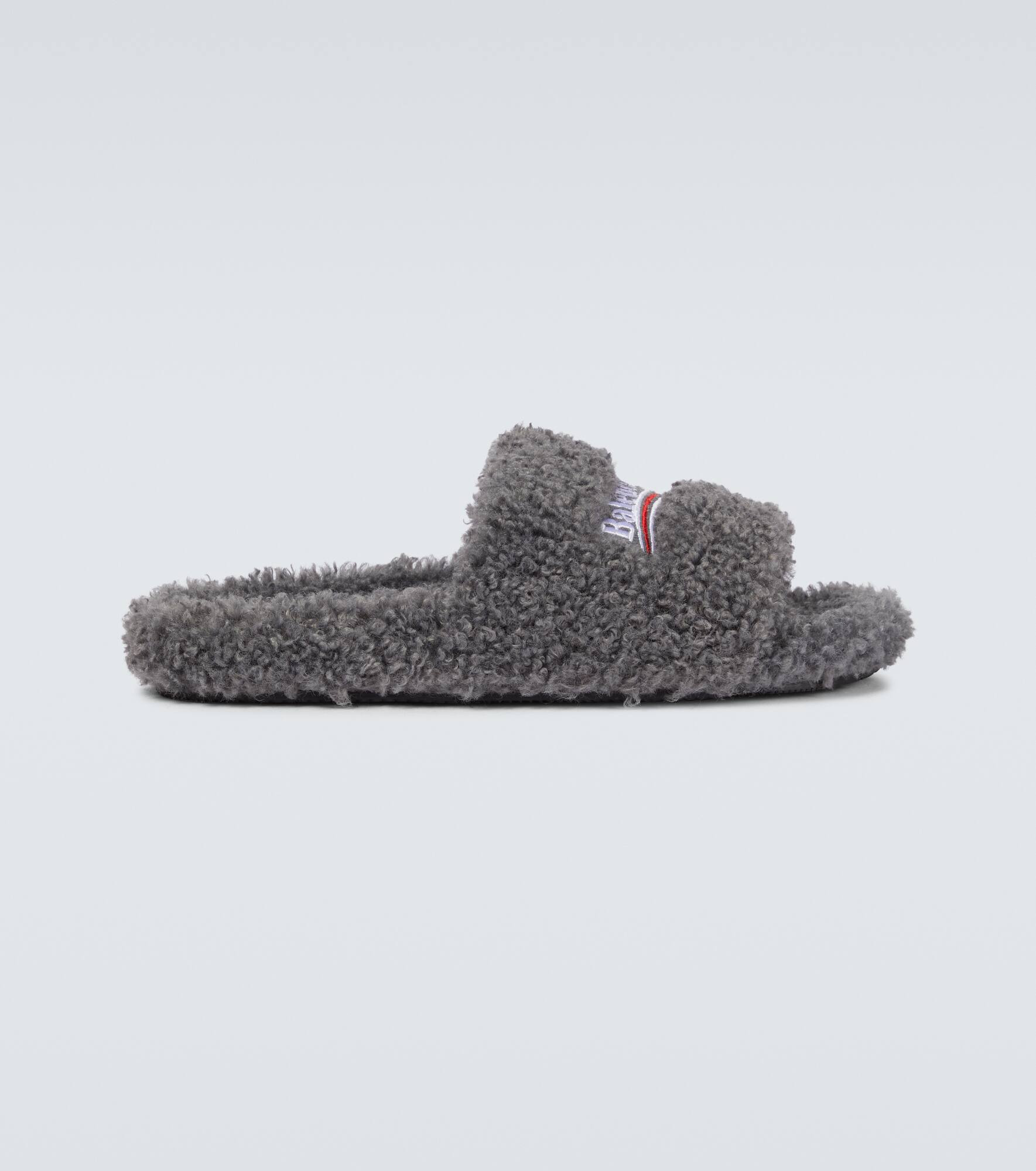 Made in Italy with furry fabric uppers, these Balenciaga slides come in gray and are embroidered with the label's Political Campaign logo. Product Details - Toe shape: round open toe - Upper: fabric - Sole: fabric insole, rubber sole - Comes with a box - Lining: fabric - Designer color name: Grey/White/Red - Made in Italy - Item number: P00585082 Size & Fit - True to size - Half sizes please take the next size down - European sizes
