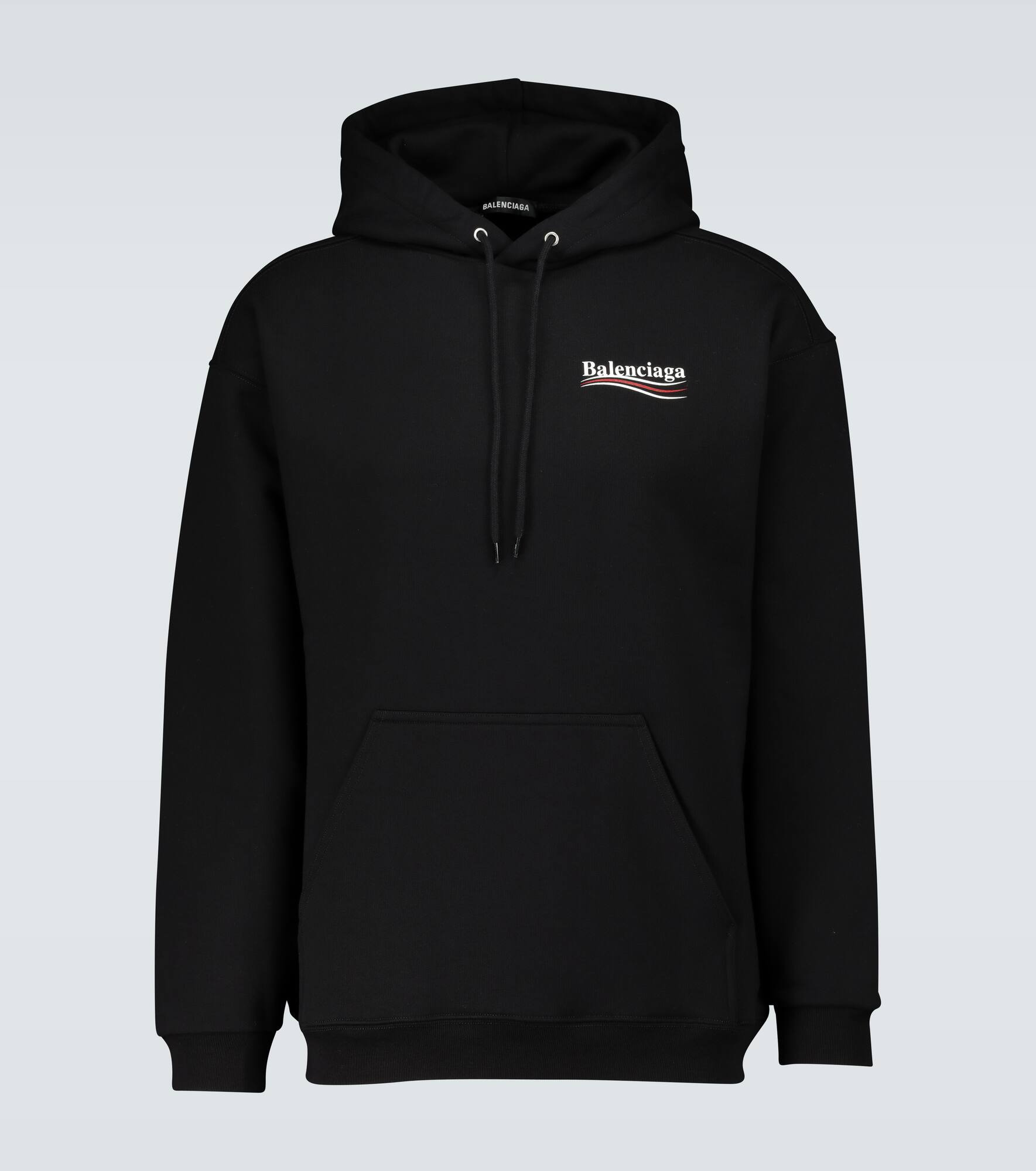 This black hooded sweatshirt from Balenciaga comes in an oversized yet slightly cropped fit and features the label's Political Campaign logo on the left chest and at the back. Product Details - Drawstring hood - Pockets: kangaroo pocket - Elasticated cuffs - Designer color name: Black/White - Made in Portugal - Material: 100% cotton - Care instructions: hand wash - Item number: P00486724 Size & Fit - True to size - Dropped shoulders - Oversized - Falls to the hip - The model in the picture is 185cm-6'1" and wearing a size M