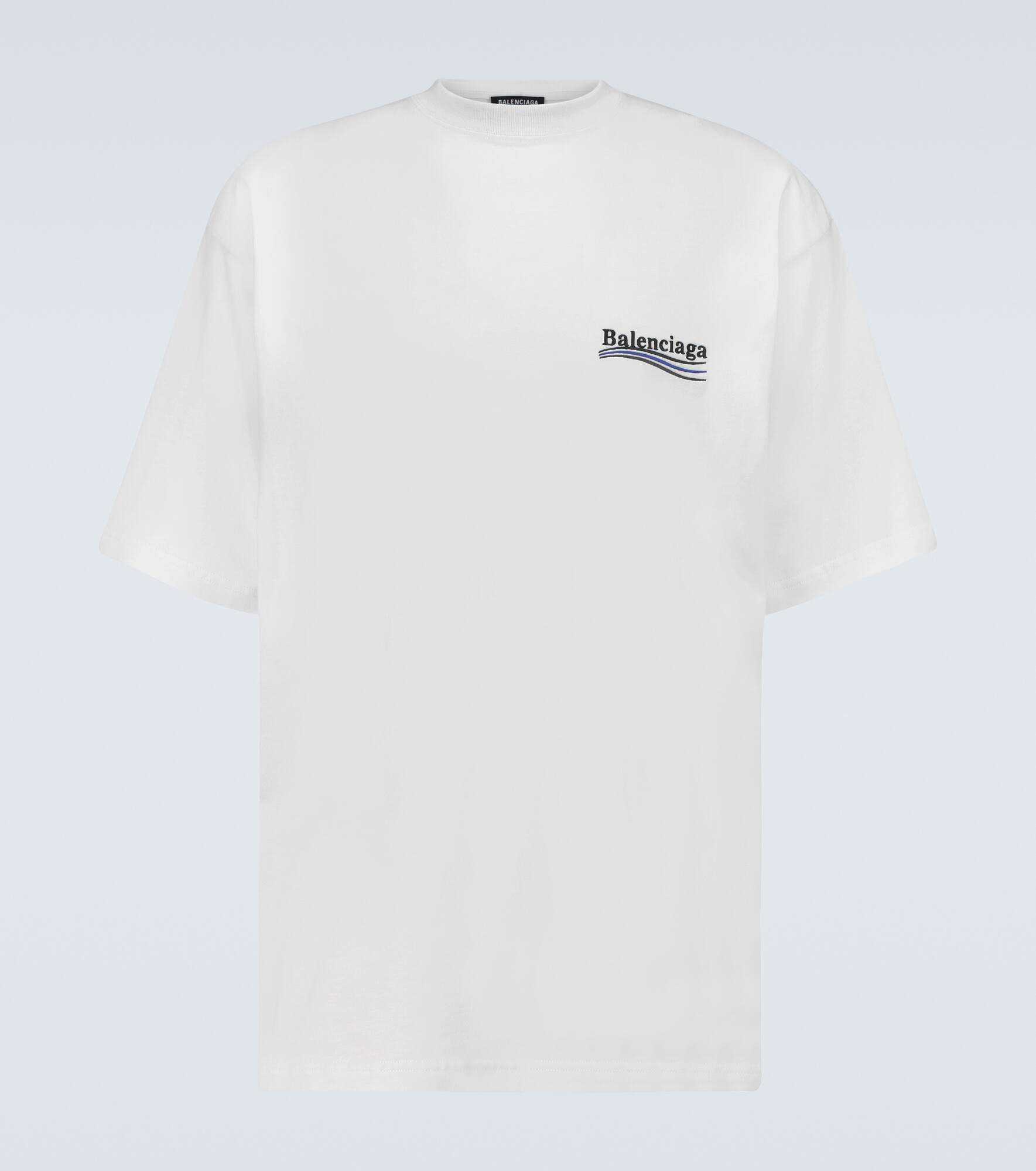 This short-sleeved T-shirt from Balenciaga is made from cotton in a large-fit. Offered in white, this T-shirt features the label's Political Campaign logo in contrasting black. - material: 100% cotton - embroidery: 100% polyester - care instructions: hand wash - Made in Portugal - Designer colour name: White
