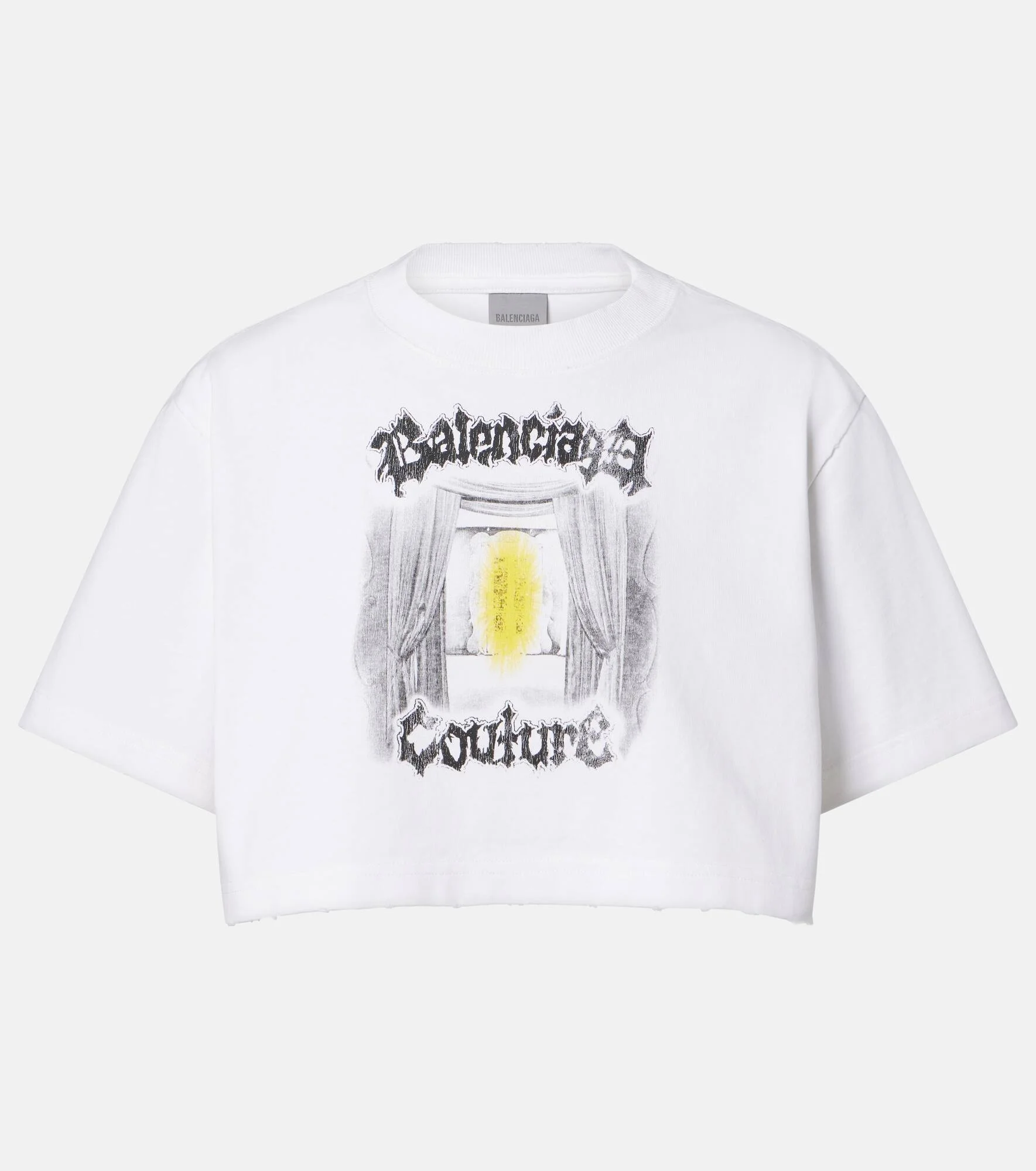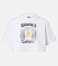 Innovation is at the heart of Balenciaga, which proudly presents its modern interpretation of fashion in every piece. This cotton jersey T-shirt features a cropped silhouette with a classic crewneck and a front print. Product Details - Material: 100% cotton - Care instructions: machine wash at 30 degrees - Made in Portugal - Color: white - Designer color name: White - Collar: crewneck - Item number: P01158804 Size & Fit - True to size - Dropped shoulders - Designed for a loose fit - Non-stretchy fabric - Cropped - The model seen in the picture is 178cm-5'10" and wearing a size XS
