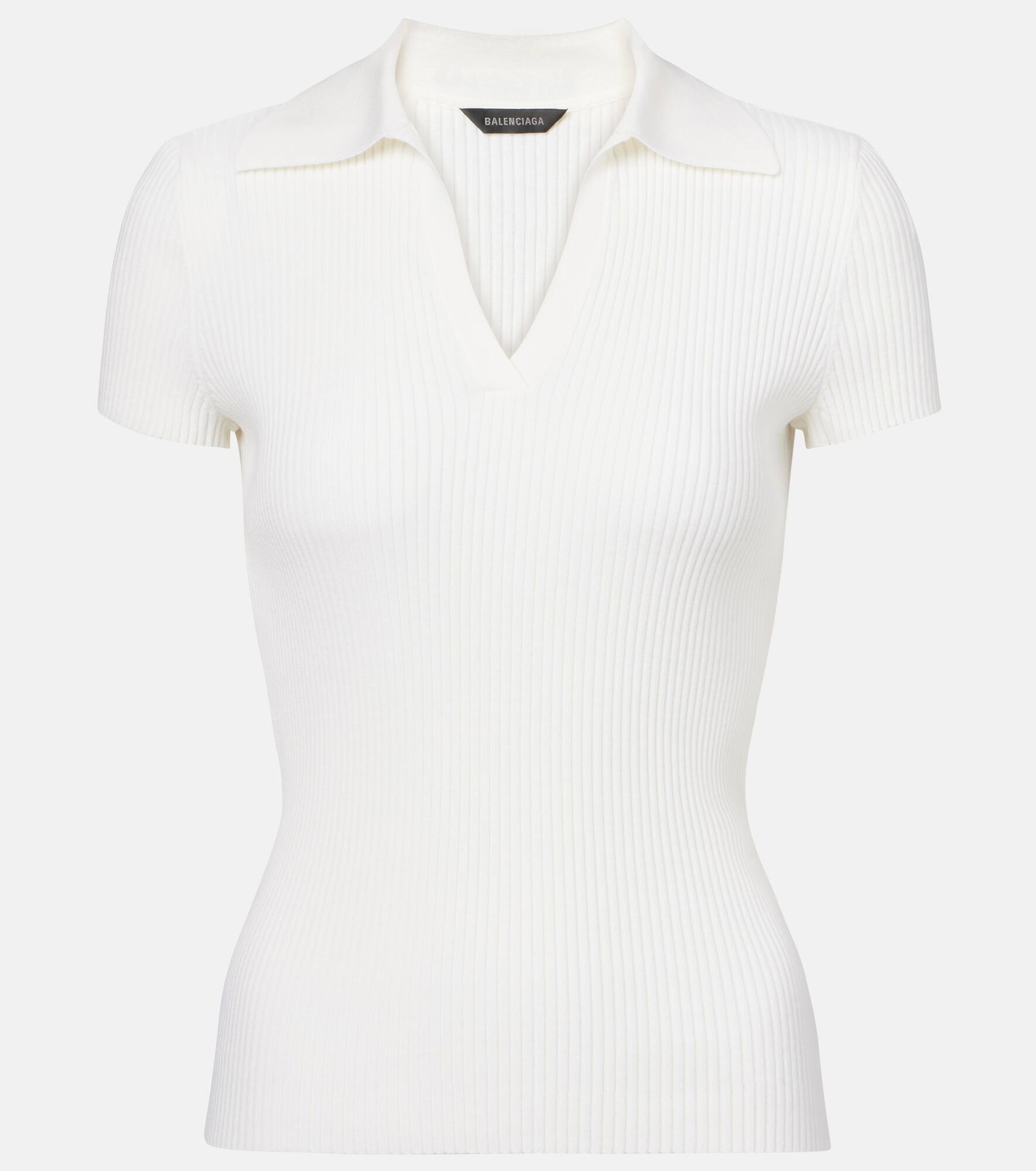Make this polo sweater from Balenciaga a building block for your ensembles. Expertly knitted from a soft wool blend, this short-style sleeved features a pointed collar and can be dressed up or down, depending on the occasion. Product Details - Material: 90% wool, 8% polyamide, 2% elastane - Care instructions: dry clean - Made in Italy - Designer color name: White - Item color: ivory - Item number: P01033701 Size & Fit - True to size - Cinched waist - Stretchy fabric - Falls to the hip - The model seen in the picture is 178cm-5'10" and wearing a size XS