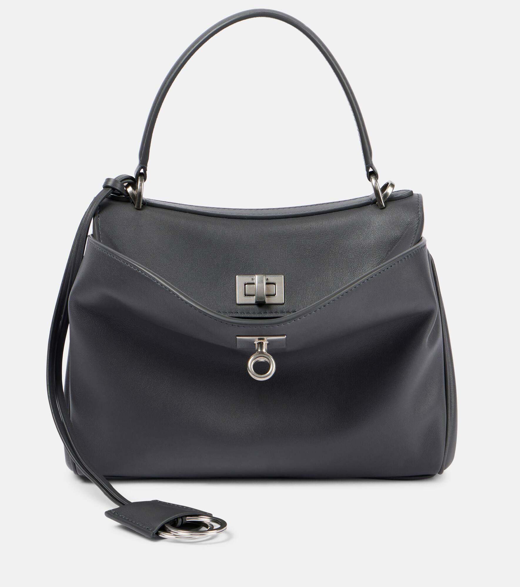 Innovation is at the heart of Balenciaga, which proudly presents its modern interpretation of fashion in every piece. The Rodeo tote bag is crafted from leather and features a detachable shoulder strap and leather key holder. Product Details - Material: leather - Lining: leather - Made in Italy - Designer color name: Grey - Item color: gray - Internal details: internal slot pocket - Closure: push-lock fastening - Top handle, Detachable shoulder strap - Hardware color: silver - Item number: P01055614 Size & Fit - Height 17cm-6.5" - Width 22,8cm-9" - Max. depth 9cm-3.5" - Length of handle 27cm-10.5" - Length shoulder strap 141cm-55.5"
